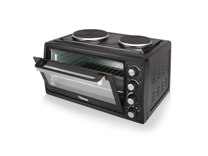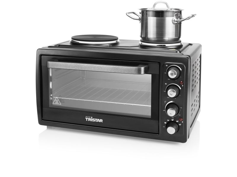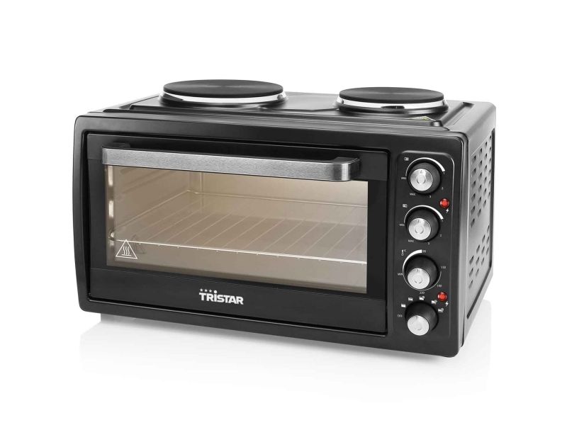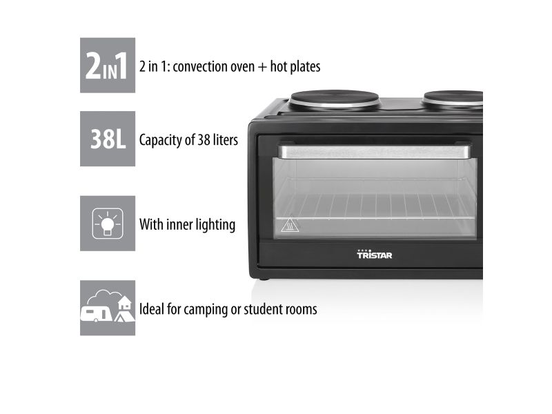 Reasons to choose the Tristar OV-1443 Convection Oven:Never cramped for space in your kitchen thanks to combination of oven and hot platesComplete with grill rack and oven tray with a special handle to remove them safelyTemperature range from 90° up to 230° for crispy bread and pizzaAdjustable upper or lower heating with or without convectionIdeal for smaller families and students thanks to the 38 liter volume