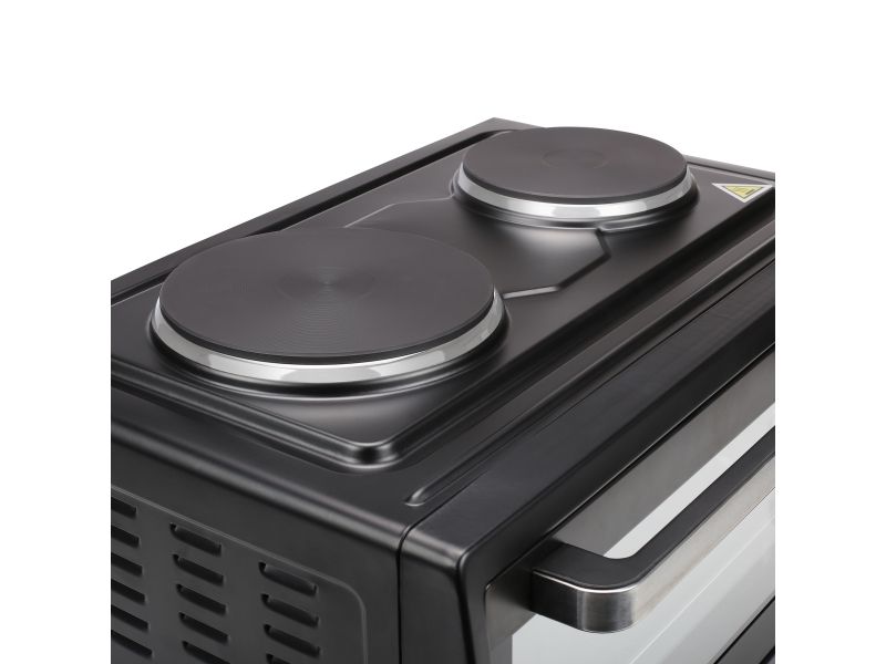 Using the dials on the front of the Tristar Convection Oven you can individually operate the hot plates. There is one larger and one smaller hot plate with respectively 1000 and 600 Watt power on top of the oven. The total power of the oven and hot plates combined is 3100 Watts.