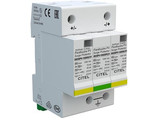 Transientenschutz für Photovoltaikanlagen DS50PVS Serie Typ 2 DC SPD, 1000V DC, Varistor + GDT CM+DM