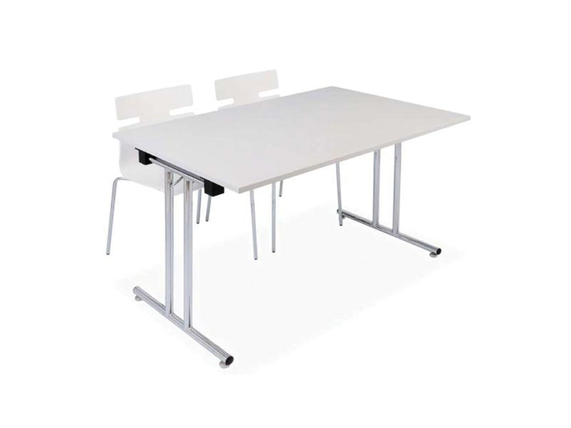 Fumac 1500 Klapptisch, klappbarer Tisch mit Rollen an einer Seite. 22 mm starke Tischplatte aus Dekorlaminat mit gerader ABS-Kante, Gestell aus Chrom, feste Höhe 74 cm inkl. Tischplatte, 10,5 cm eingeklappt, Tiefe 80 cm.