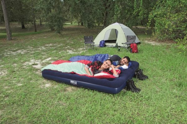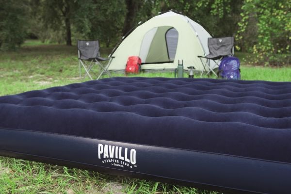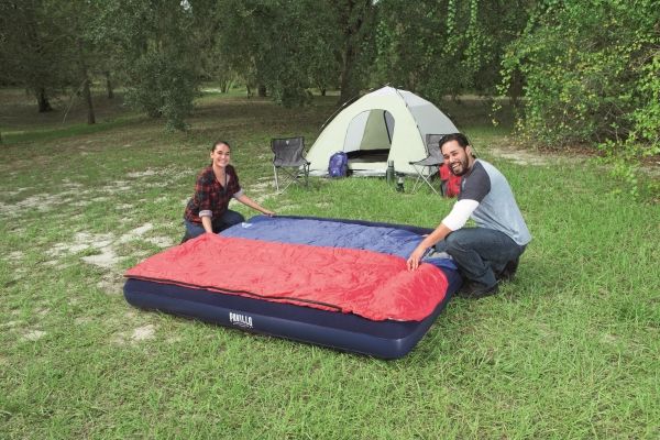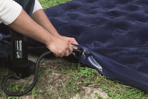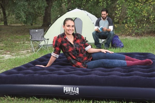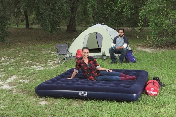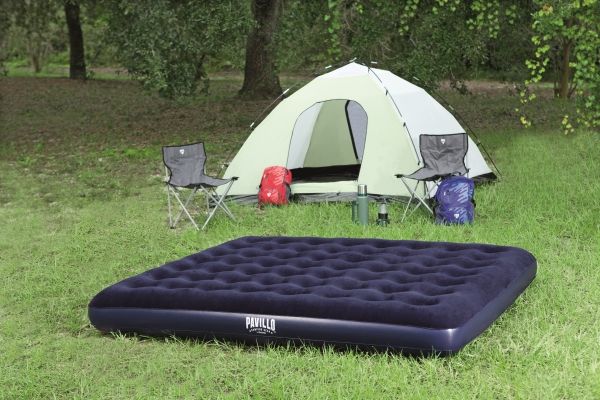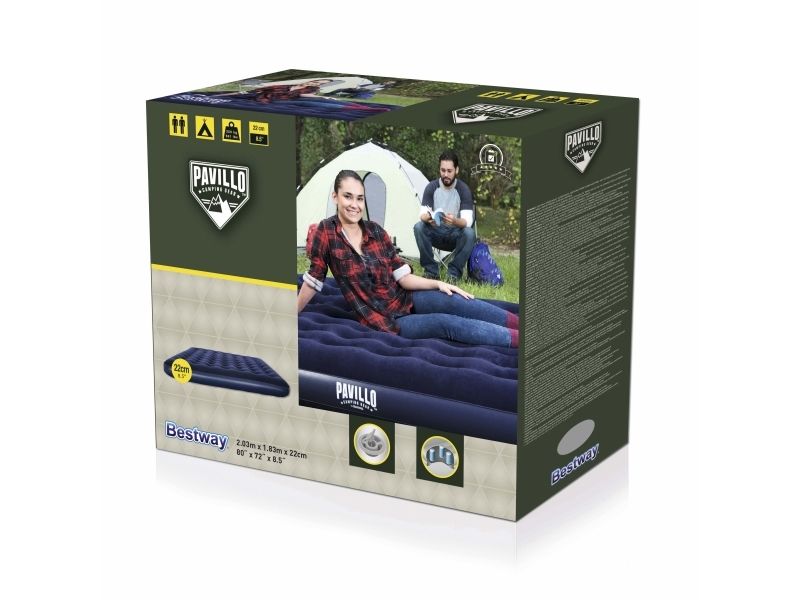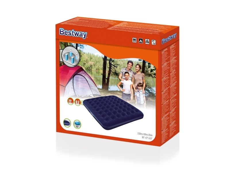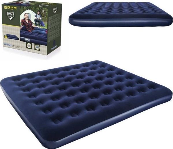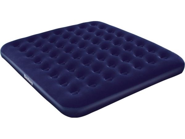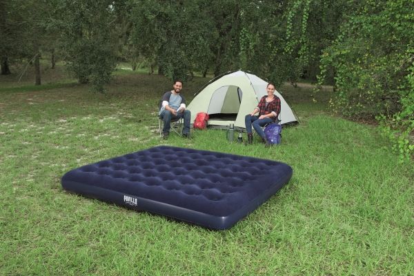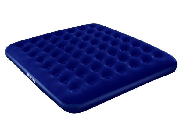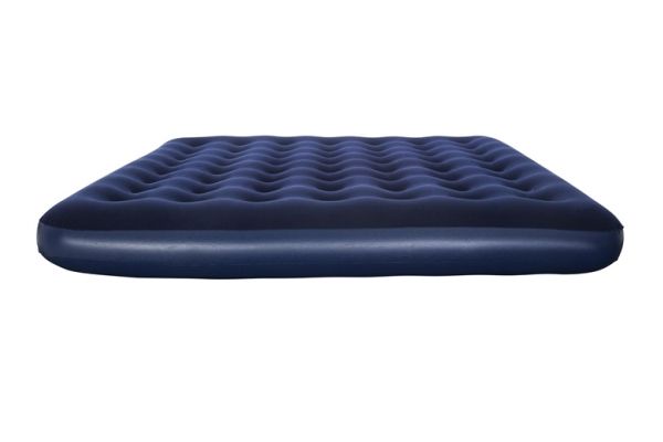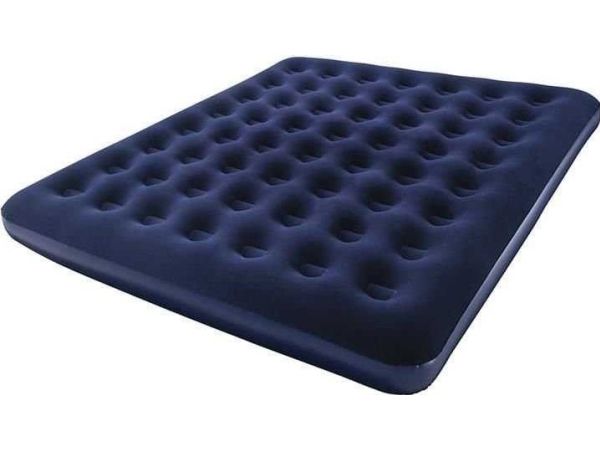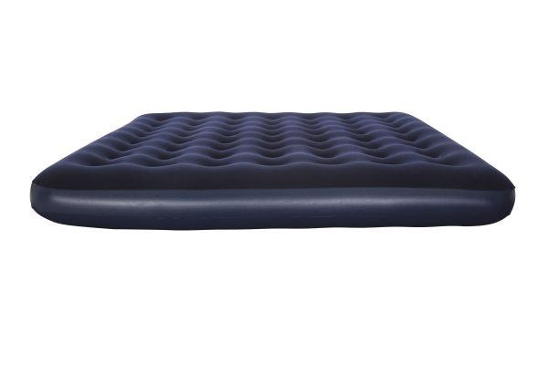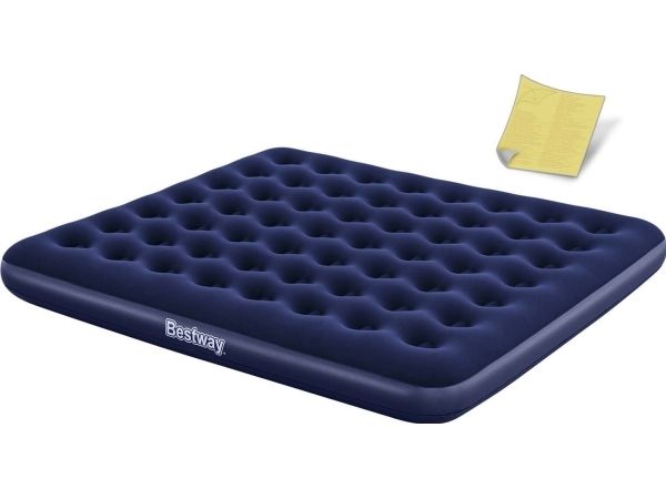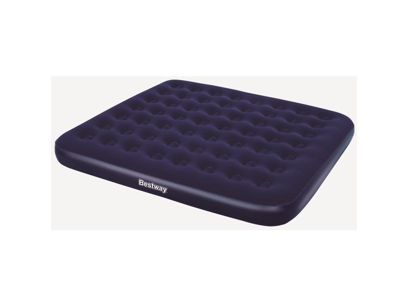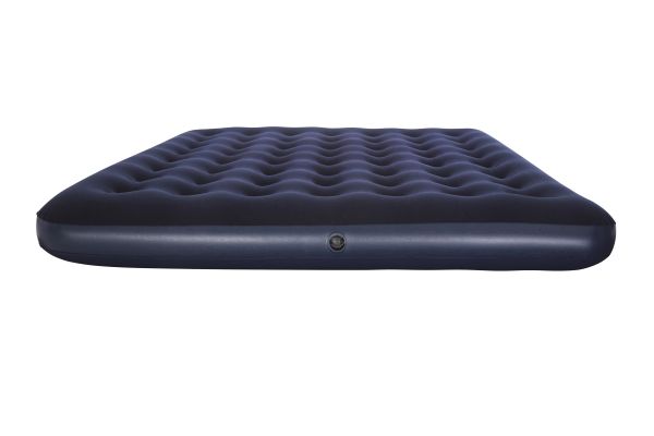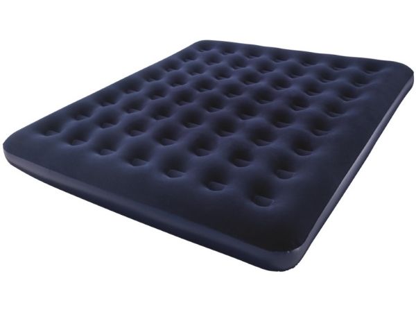 FLOCKED AIR BED / KING - Sturdy pre-tested vinyl - Quick inflation/deflation screw valve - Comfortable flocked sleeping surface - Sturdy coil beam construction - Great for indoor & outdoor use - Heavy-duty repair patch included Content: One air bed, repair patch