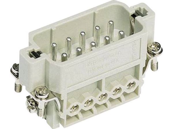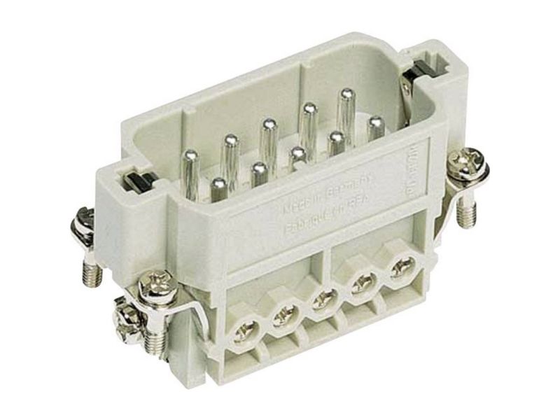 Steckverbinder für erhöhte Umweltanforderungen, hohe mechanische Stabilität auch bei Vibration und Schock durch Verriegelung. Anwendung in: Maschinenbau, Windkraft, Schaltschrankbau, Bahntechnik. Hersteller-Typenbezeichnung: Han® 10A-F-s