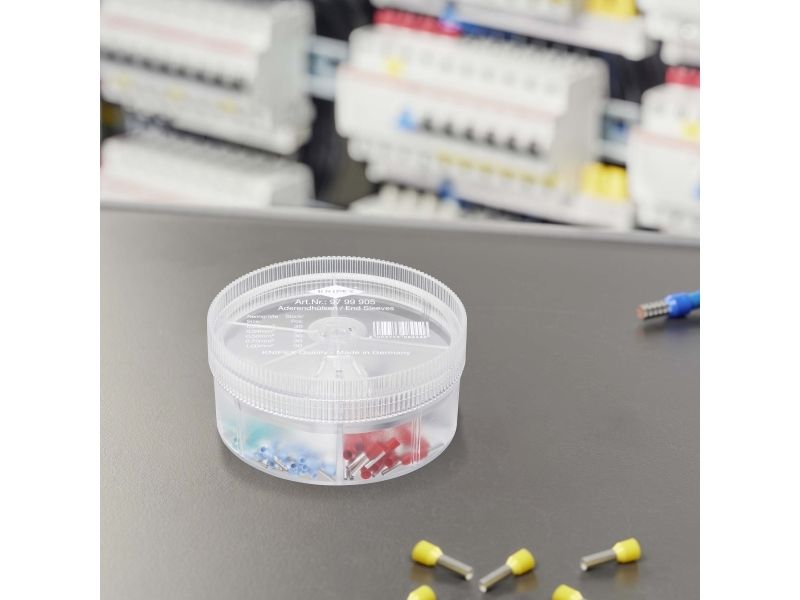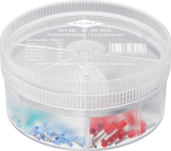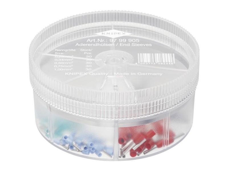 97 99 905 Sortimentbokse Praktische, handliche und robuste Sortimentsbokse. Dreifach verwendbar bis zur Anbringung von einzelnen Kabeln. Mit isolierten Kabeln nach DIN. Format: Ø 90 mm, Höhe 44 mm Leveringsomfang: 1 x KNIPEX kabeltyller blå 10 mm (30 x 0,25 mm² / AWG 24), 1 x KNIPEX kabeltyller turkis 10 mm (30 x 0,34 mm² / AWG 22), 1 x KNIPEX kabeltyller hvid 14 mm (30 x 0,5 mm² / AWG 20), 1 x KNIPEX kabeltyller grå 14 mm (30 x 0,75 mm² / AWG 18), 1 x KNIPEX kabeltyller rød 14 mm (30 x 1 mm² / AWG 17),