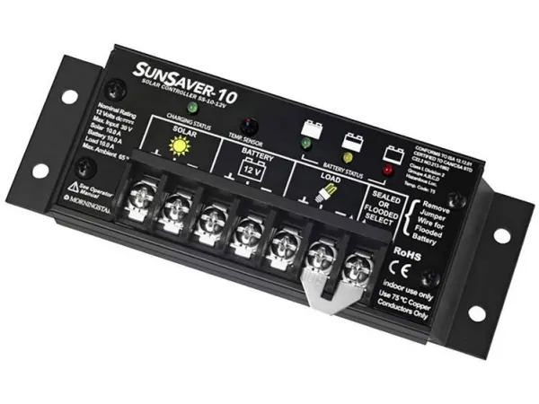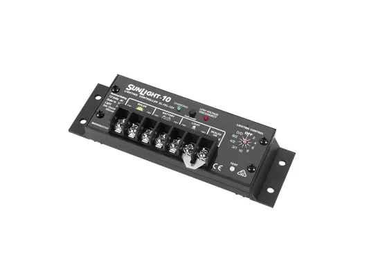 Laderegulator SunSaver4-trins-opladning · fuldstændig elektrisk beskyttelse · selvdiagnose til registrering af kritiske fejl · ægte 0 til 100% PWM-tastforhold · temperaturkompensation · Power-MOSFET-design · godkendt til anvendelse i områder med eksplosionsfare · fuldautomatisk drift og automatisk fejlfinding · vedligeholdelsesladning · udligningsladning · fuld kapslet · epoxy-støbemasse · over- og dybdeafladningsbeskyttelse · kortslutningssikker · polvendingsbeskyttelse · temperaturkontrol · overspændingsbeskyttelse 1500 W pr. forbindelse · LED-visning · fastgørelsesøje