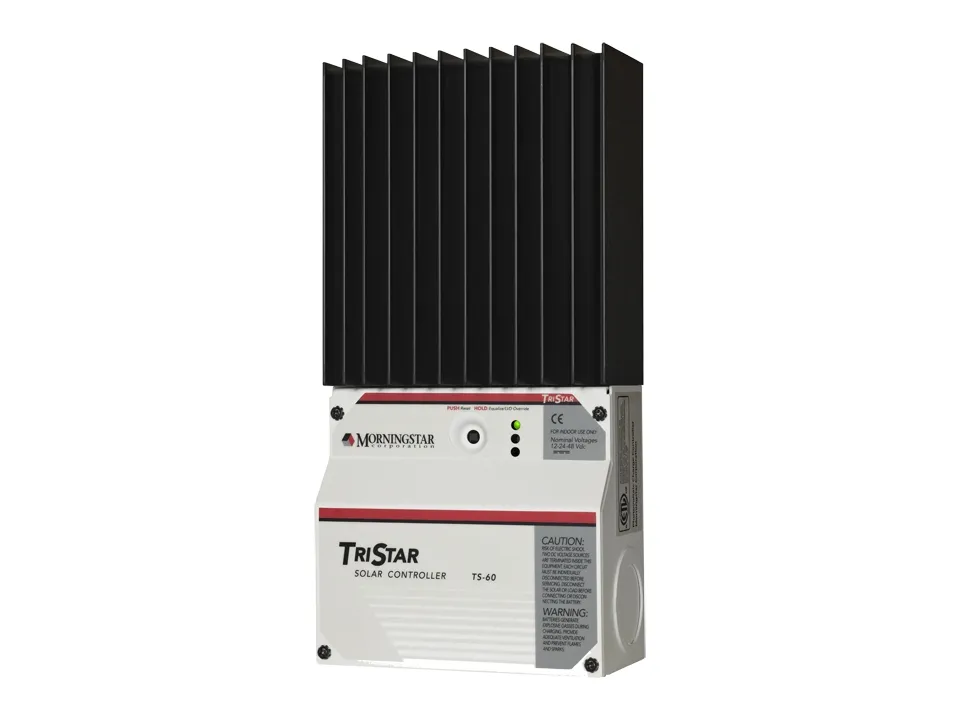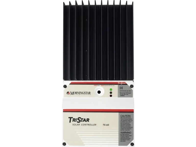 Laderegulator TS-60Tre-funktions-regulatorer · Høj virkningsgrad · Pålidelig og holdbar · DIP-kontakten giver brugeren valget mellem 7 forskellige digitale indstillinger · Til solcelle-, vind- eller hydroanvendelser · Robust termodesign uden køleventilator · Automatisk spændingsregistrering · Lavt strømforbrug · Kontinuerlig drift ved fuld effekt · Seriel RS-232-tilslutning · Over- og dybafladningsbeskyttelse · Kortslutningssikker · Overspændingsbeskyttelse · Temepraturkontrol · Beskyttelse mod omvendt polaritet · Beskyttelse mod tilbagestrøm · LED-displayDenne Tristar-regulator fra Morningstar er en tre-funktionsregulator til pålidelig solcelleopladning af batterier, lastregulering og omledningsregulering. Regulatoren arbejder hver i en af disse tre driftsformer, og til samtidig brug af flere funktioner kan der anvendes to eller flere regulatorer. Laderegulatoren er baseret på højtudviklet teknologi og automatiseret produktion og giver forbløffende funktionalitet. Det valgfrie TriS