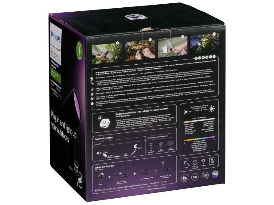 Mit unseren Hue Spots für den Außenbereich lässt sich Dein Garten neu erstrahlen! Mache Dich jetzt bereit für die nächste Gartenparty und überrasche Deine Gäste mit farbenfrohen Lichtakzenten und tollem Ambiente. Oder genießen lange Abende bei warmweißem Licht zum Entspannen. Alles was Du benötigst ist ein Basis-Set mit Netzteil, an welches bis zu 5 Hue Niedervolt-Leuchten angeschlossen werden können. Inklusive Verlängerungskabel mit einer Länge von 5m.
