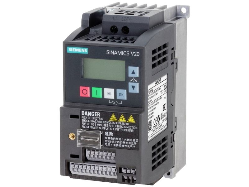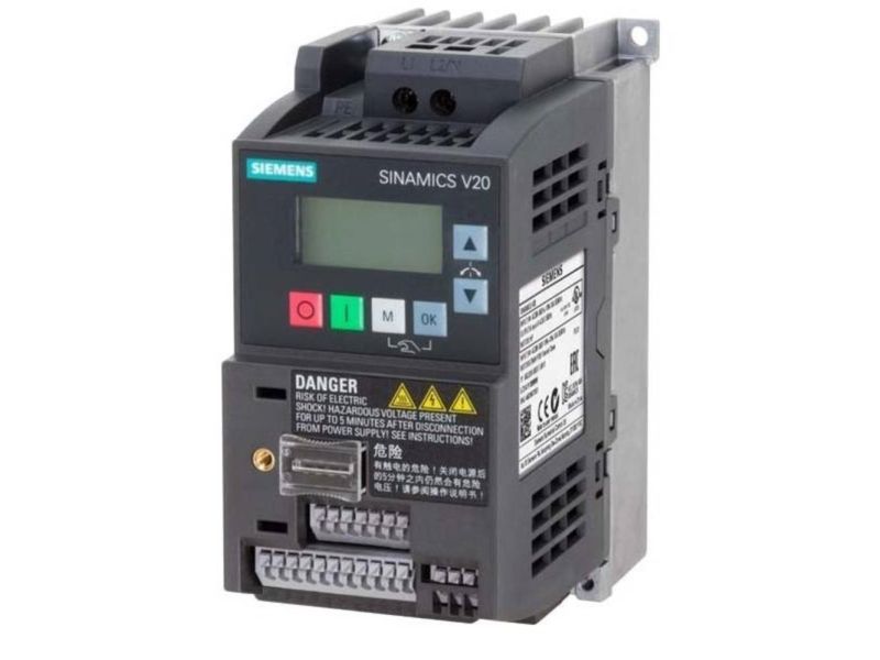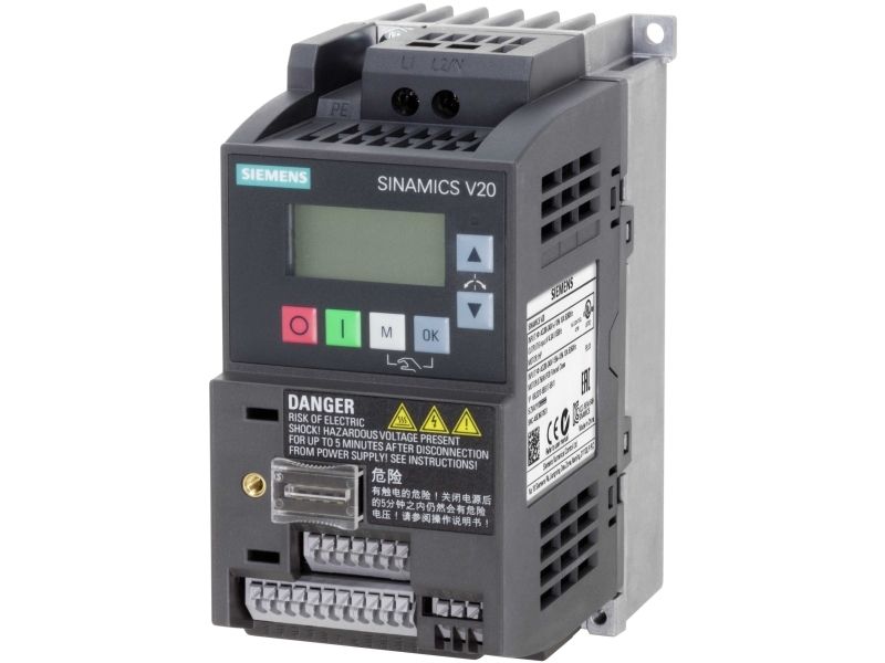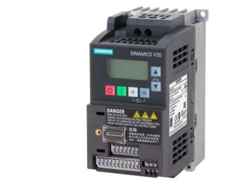 SINAMICS V20, IP20, FSAB, B, 1 AC 200-240 V, 0,55 kWSINAMICS V20 1AC200 240V-10/-18% 47-63Hz nominel effekt 0,55 kW med 150 % overbelastning i 60 sek. integreret filter C1 I/O-interface: 4DI, 2DO, 2AI, 1 AO feltbus: USS/Modbus RTU med indbygget BOP beskyttelsesklasse IP20/UL Open type størrelse: FSAB 68x14 2x128 (WxHxD) frekvensomformer SINAMICS V20 den alsidige omformer til basisformål til industrielle applikationer og kommercielle applikationer. SINAMICS V20 udmærker sig ved korte ibrugtagning tider, enkel betjening, robusthed og omkostningseffektivitet. Den omformer kan uden ekstra moduler direkte ud af emballagen. Til forøgelse af energieffektivitet er omformer med en optimal styring procedurer med automatisk flow sænkning udstyret. Den giver desuden den aktuelle energiforbrug og har flere integrerede energibesparende funktioner. Behold running-tilstanden muliggør en stabil drift også ved vanskelige og svingende-forhold. Den omformer er i 7 størrelser i et effektområde fra 0,12 kW op til 30 kW ti