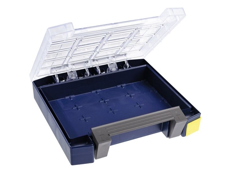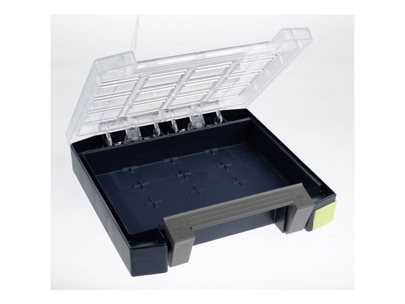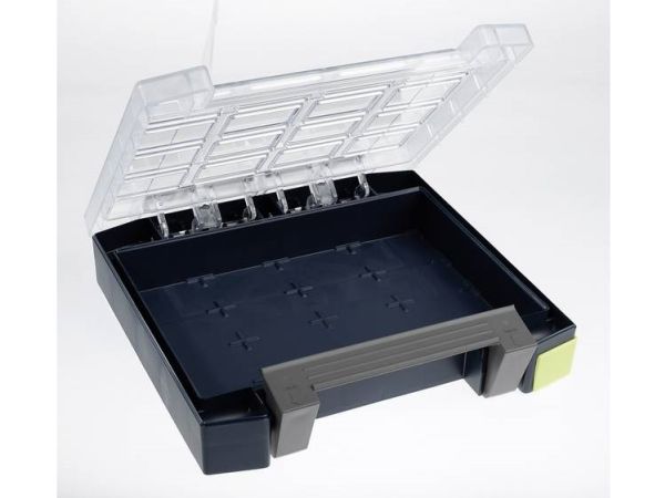Sortimentskasten Boxxser 55 4x4-0Sortimentskasten , leer, mit Einlagen in verschiedene Größen unterteilbar, inkl. 3 ID-Etiketten (gelb, grün, grau), Rastersysteme in Deckel und Boden verhindern ein Abrutschen des Inhalts.