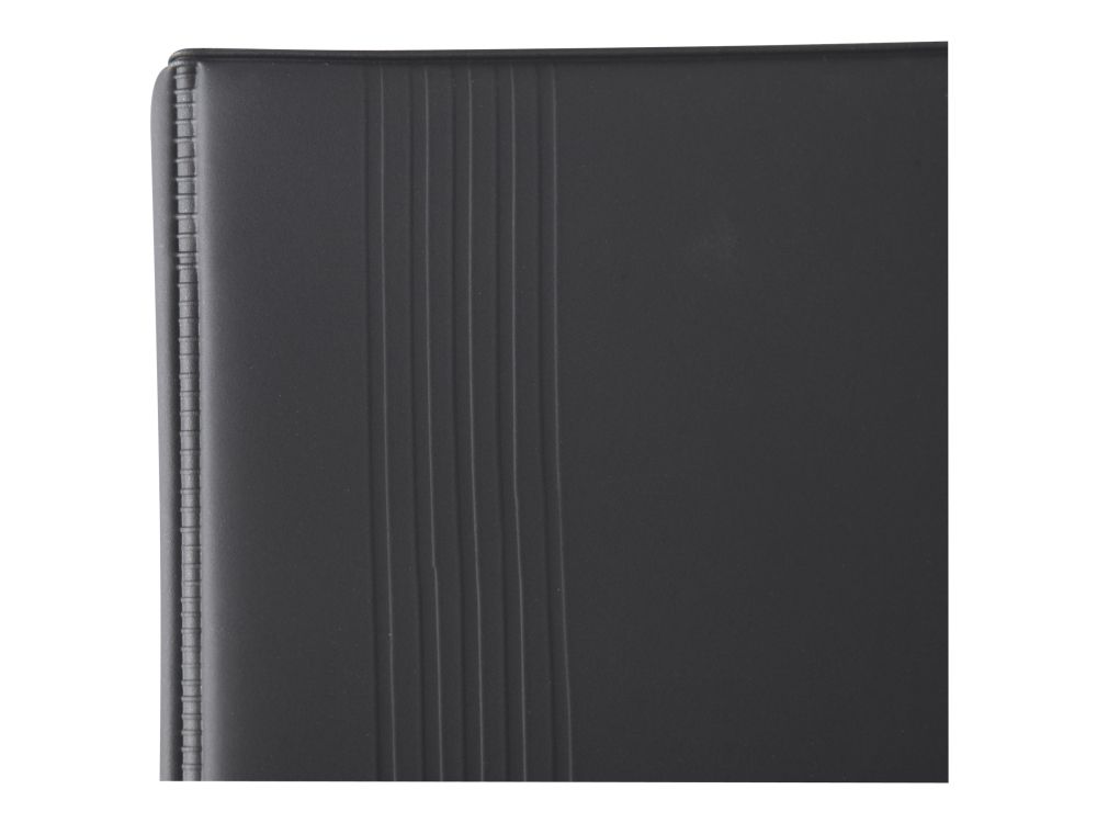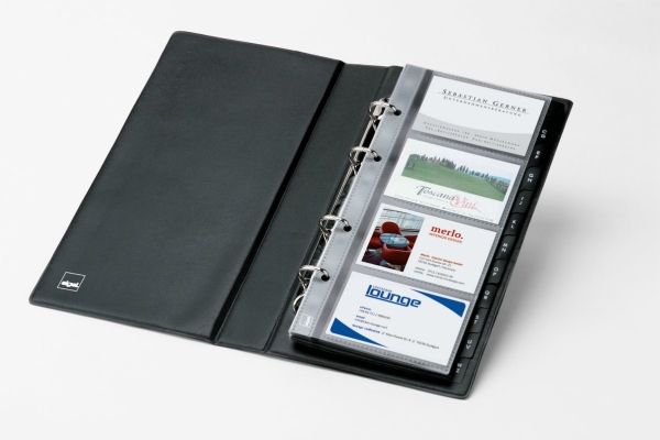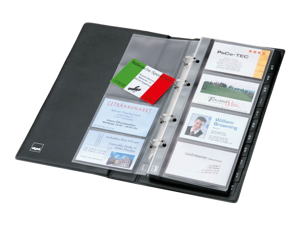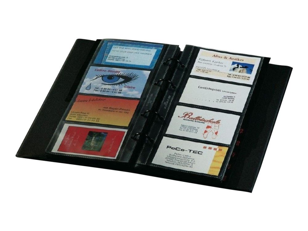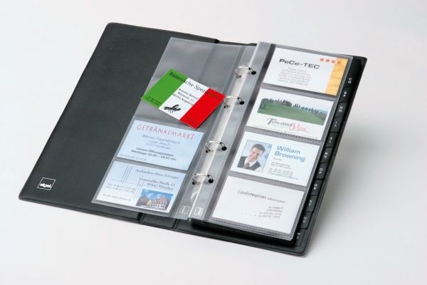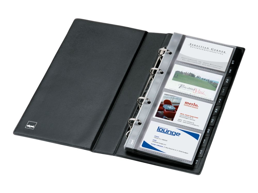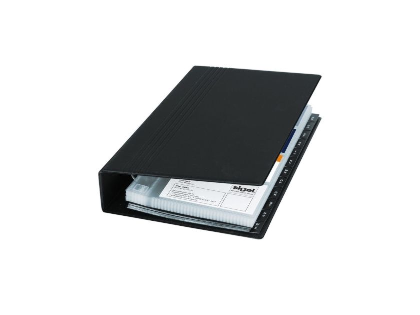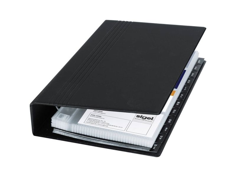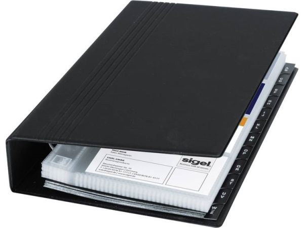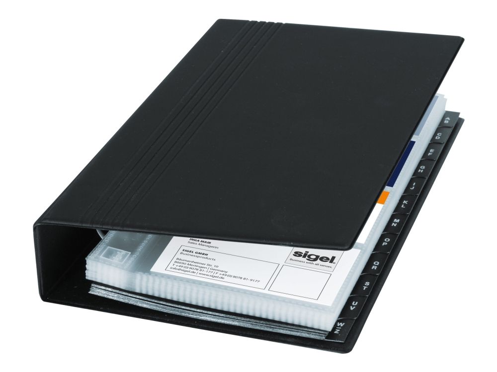 Visitenkarten-Ringbuch aus strapazierfähigem schwarzen Kunststoffeinband mit matt-satinierter Oberfläche und Linienprägung zur platzsparenden und übersichtlichen Organisation von Visitenkarten und anderen Karten. Dank stabiler 4-Ringmechanik und alphabetischem Register ist ein schnelles Einsortieren und Wiederfinden der Karten garantiert. Die 25 mitgelieferten transparenten Hüllen, die sowohl auf der Vorder- als auch Rückseite befüllt werden können, bieten Platz für bis zu 200 Karten (max. 90 x 58 mm). Mit den passenden SIGEL Nachkaufhüllen VZ350 (10 Hüllen für bis zu 80 Karten) kann es auf 280 Visitenkarten erweitert werden. Die Größe des Ringbuchs beträgt 147 x 265 x 44 mm (B x H x T).
