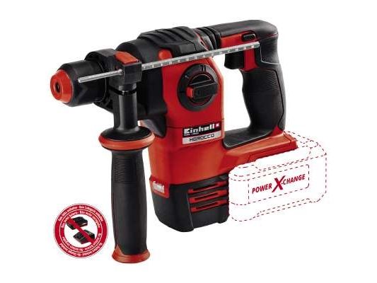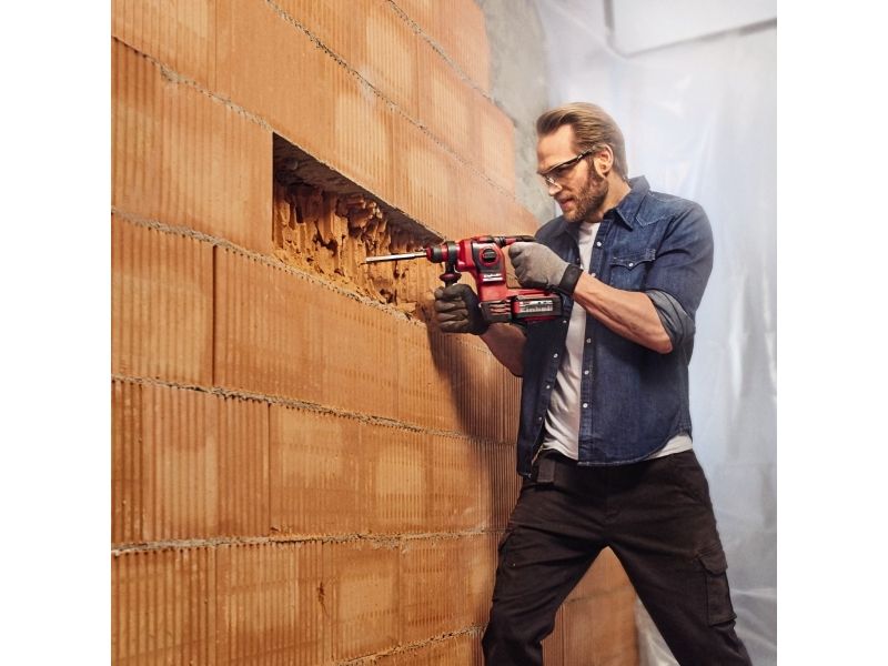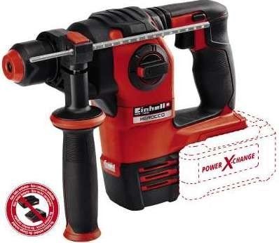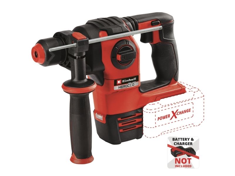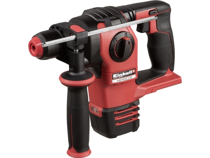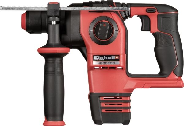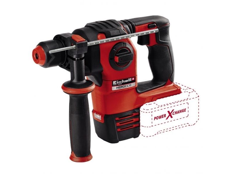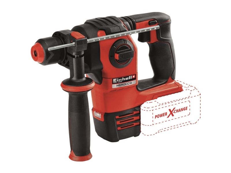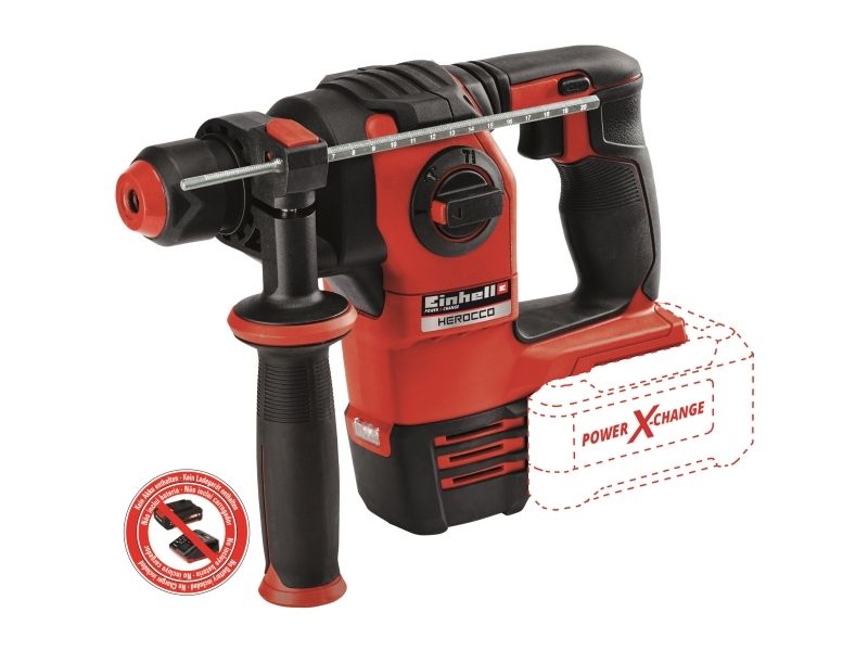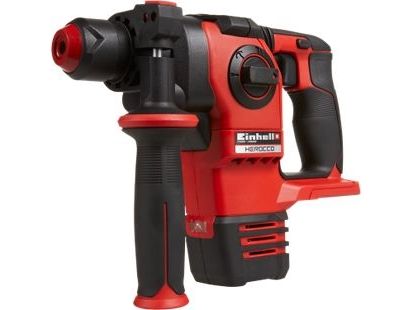 The Einhell cordless rotary hammer Herocco is a reliable performer: for drilling, impact drilling or chiseling with or without lock, the cordless rotary hammer is a valued allrounder. The brushless motor delivers more power and provides longer operation. Designed as a member of the Power X-Change family, all the rechargeable batteries in the system series can be used flexibly and without restriction in the workshed and garden tool products from the system series. The pneumatic impact mechanism, which has a frequency of up to 5,500 impacts per minute, makes effortless work of drilling even into concrete - with a impact power of 2.2 joules and a drilling capacity in concrete of 20 millimeters. Tools can be changed quickly thanks to the universal SDS-plus tool chuck with auto-slip-in function. The speed electronics is finely adjustable for sensitive operation. For comfortable and tireless operation the grip area is ergonomically designed and has a soft grip. The LED light provides optimum illumination for the work area. The product is supplied with a magnetic bit adapter for screwing in a transport and storage case E-Box. The batteries and charger are available separately. For optimum operation it is recommended to use a 3.0 Ah battery or higher.