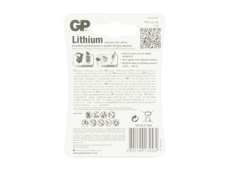 GP Lithium is the most powerful AA battery and delivers the best performance for professional and energy demanding devices. It supplies precise power for medical devices and functions well under extreme weather conditions.