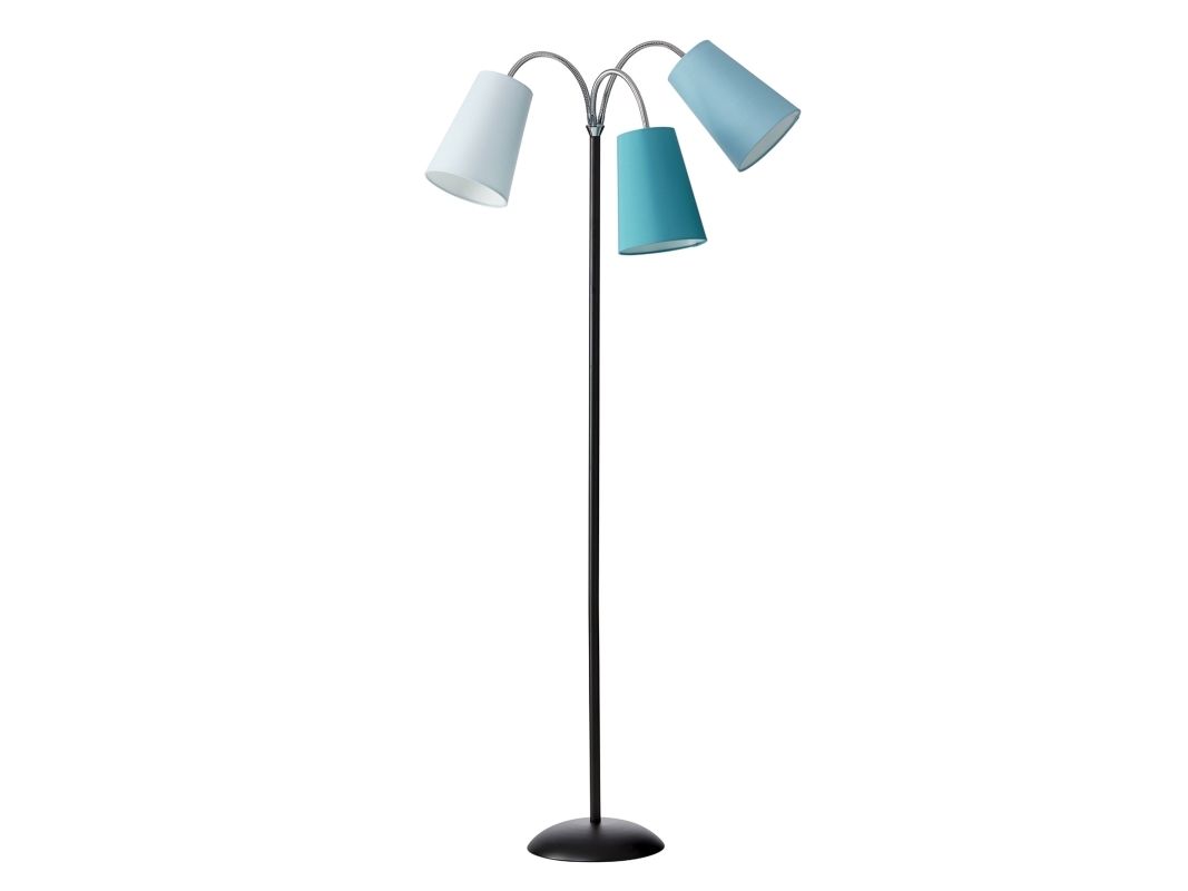 Salsa Stehleuchte mit schwarzem Sockel und 3 Schirmen (aqua, hellblau und petroleum). Mit drei flexiblen Chromarmen und Schalter am Kabel. E14 x 3 - Max 40 Watt