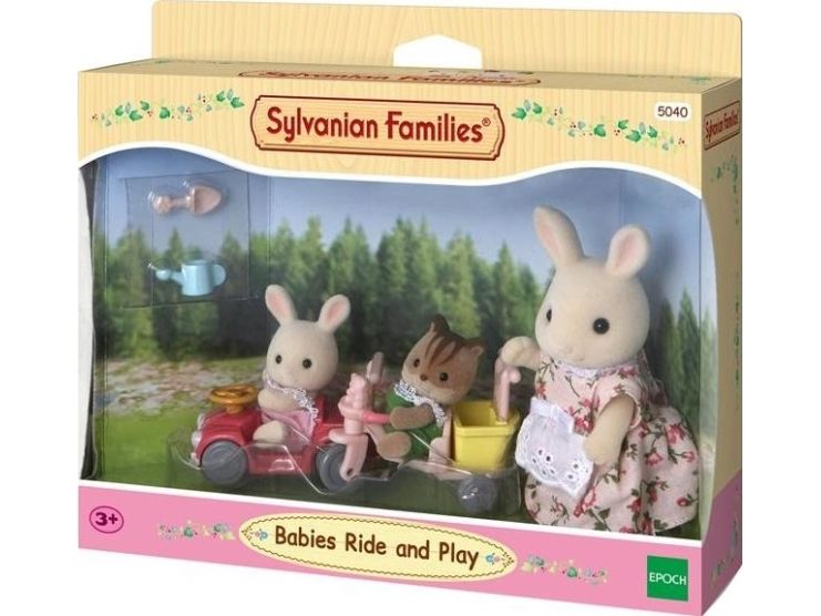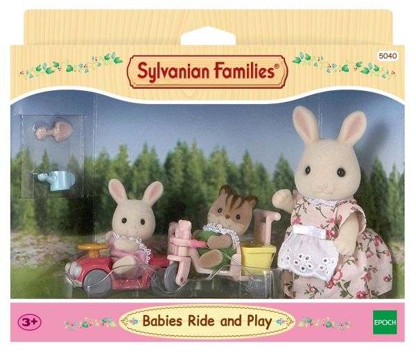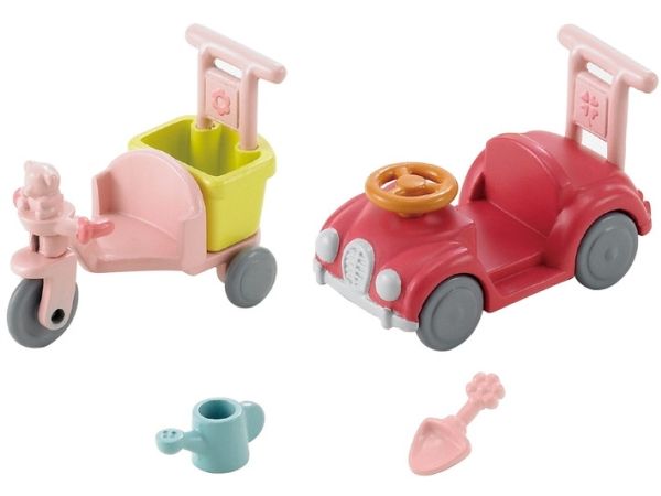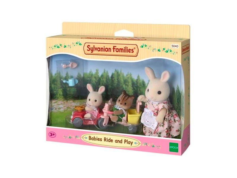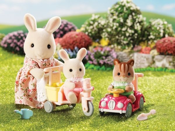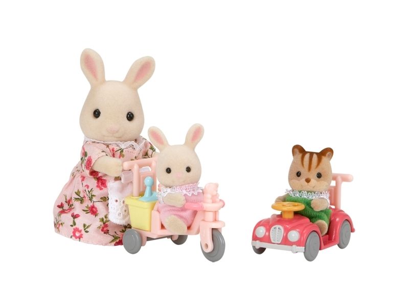 Mother rabbit takes babies to ride around a park in their new push car and tricycle! Includes mother rabbit, baby rabbit and squirrel, tricycle with basket & rotating wheels, car with rotating steering wheel & tires, 2 attachable push handles, watering can, and shovel.