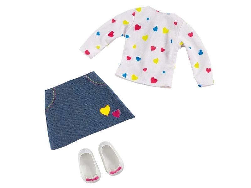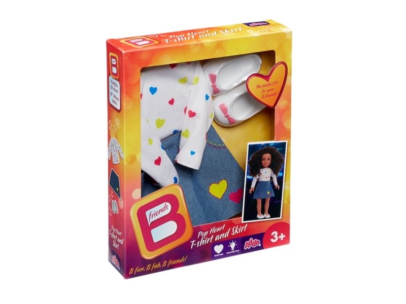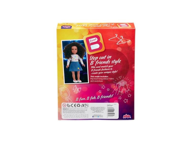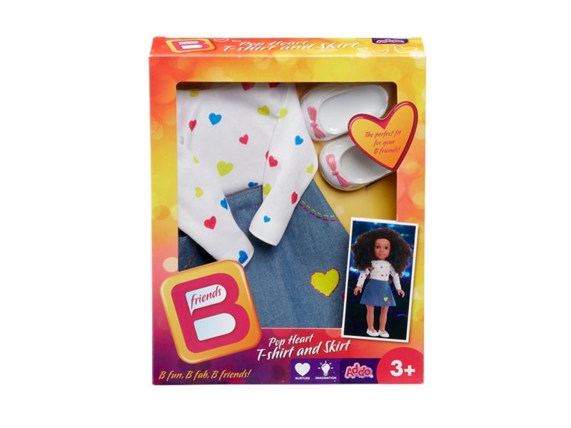 Bfriends sind wunderschöne Puppen mit beneidenswertem Haar, die man nach Belieben stylen kann. Und sie sind alle Freunde! Kombinieren Sie die verschiedenen Outfits, um einen einzigartigen Stil zu kreieren. Dieses Set enthält eine Bluse mit verschiedenfarbigen Herzen und einen Jeansrock, ebenfalls mit Herzen, sowie weiße Schuhe. Ab 3 Jahren.