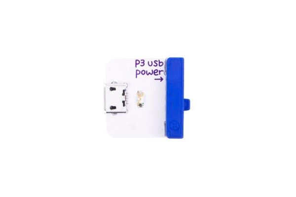 The USB power Bit may be the smallest in the series, but it's big enough to send electricity to all your creations! This Bit lets you power your circuit through a micro USB cable. It can be connected to a computer or the rechargeable battery.