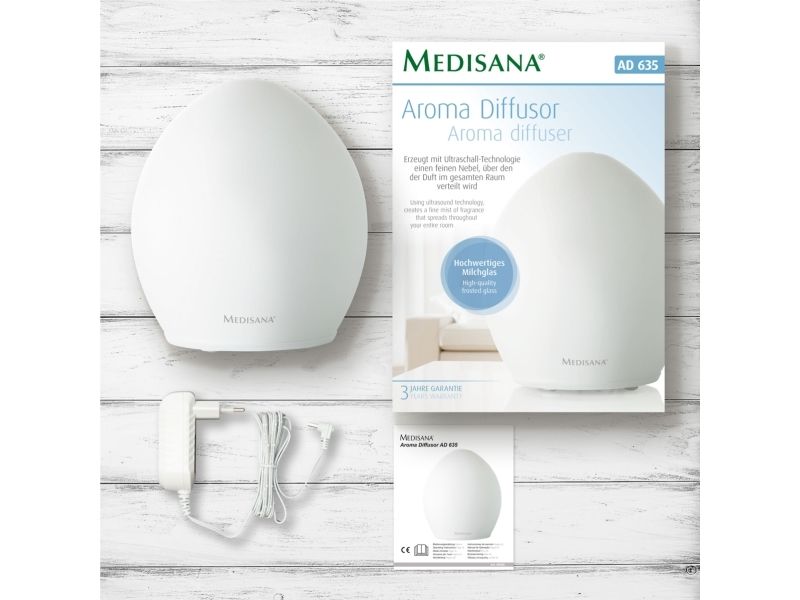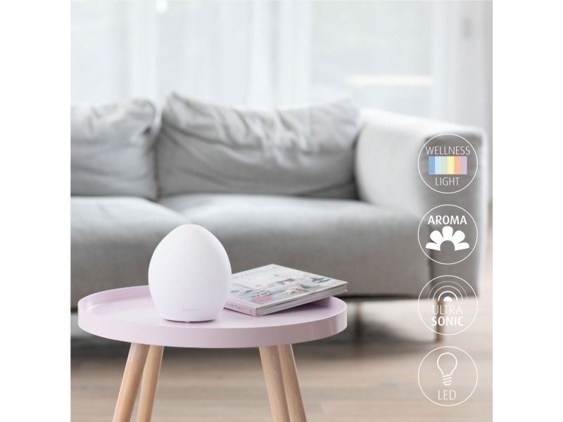 Der dekorative Aroma Diffusor AD 635 ist ein stilvolles Wohnaccessoire ohne sichtbare Bedienelemente. Er erzeugt mit moderner Ultraschall-Technologie einen mikrofeinen Nebel, über den das Aroma gleichmäßig im ganzen Raum verteilt wird. Zu einem angenehmen Raumklima gehört nicht nur der Duft, sondern auch die entsprechende Beleuchtung. So verfügt der Aroma Diffusor über ein Wellness-Licht mit integriertem Farbwechsel in sechs unterschiedlichen Tönen. Bei leerem Tank schaltet sich der AD 635 automatisch ab.