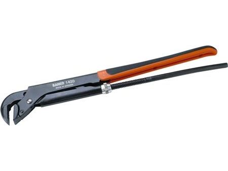 Ergonomische Universal-Rohrzange DIN5234. Oberfläche brüniert, rostgeschützt und aus SPEZIALSTAHL. Ergonomische Rohrzange. Oberer Arm aus gehärtetem Stahlblech mit ergonomischem Zweikomponenten-Thermoplast. Unterer Arm aus zähem, gehärtetem Stahl und mit Anschlag für den Gewindestift versehen. Induktiv gehärtete, schmale Backen - geeignet bei beengten Platzverhältnissen. Aggressive, nach innen abgewinkelte Zähne, innen klein und außen größer, sorgen für besseren Halt bei allen Rohrdimensionen. Mit Spannanschlag versehen. Verwendbar mit Rohrzangenschloss 142-3