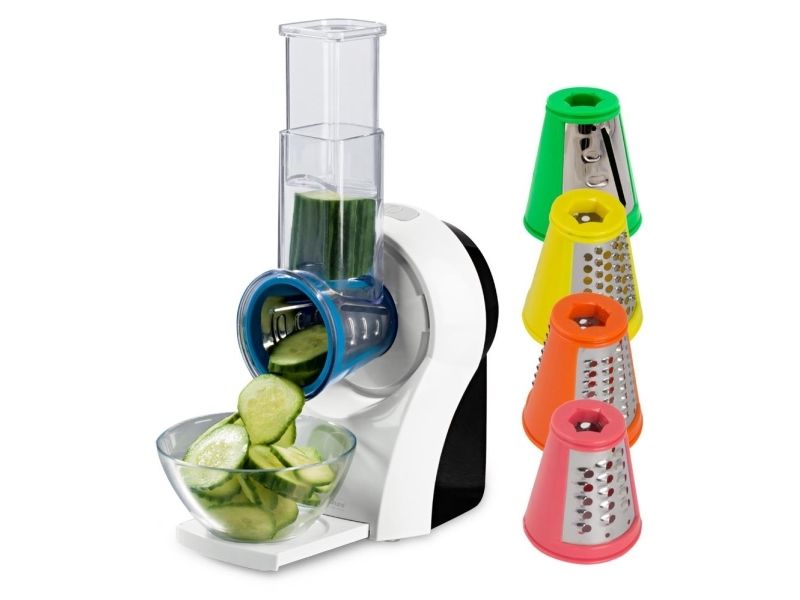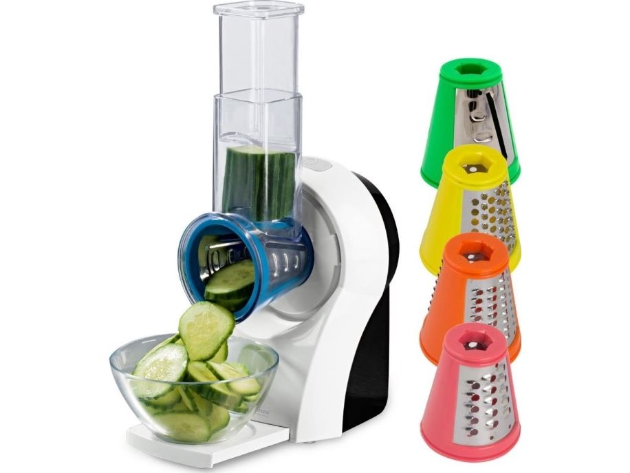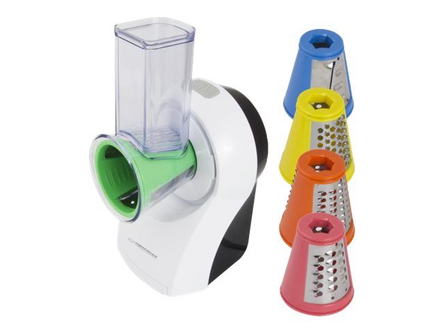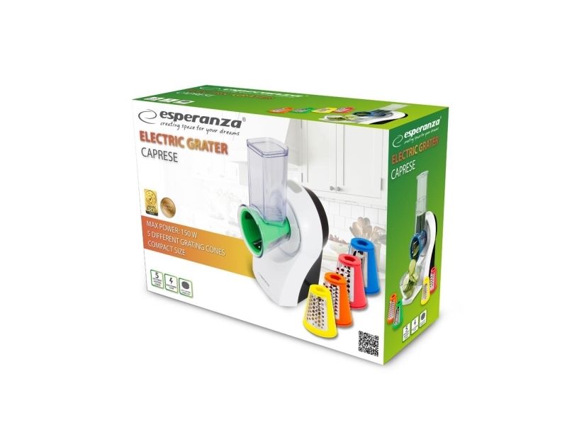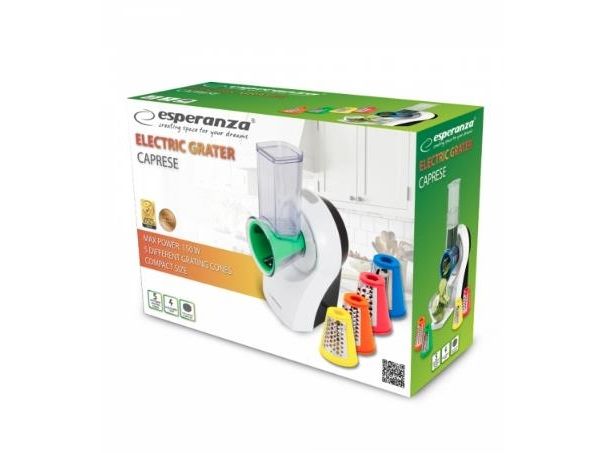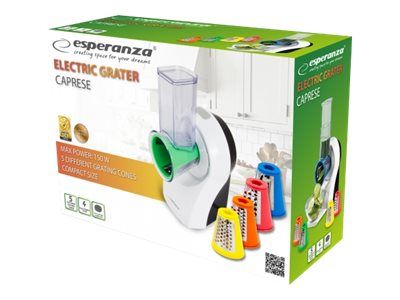 Esperanza electric grater is ideal for processing fruit, vegetables, hard cheese, chocolate, nuts and also for making buns crumbs. The 5 interchangeable grating cones allow you to adjust the shape and thickness of food to the specificity of a specific dish. It can greatly speed up the preparation of salads, soup and homemade dinners. The compact size and stylish design make it essential for every kitchen.