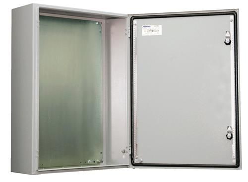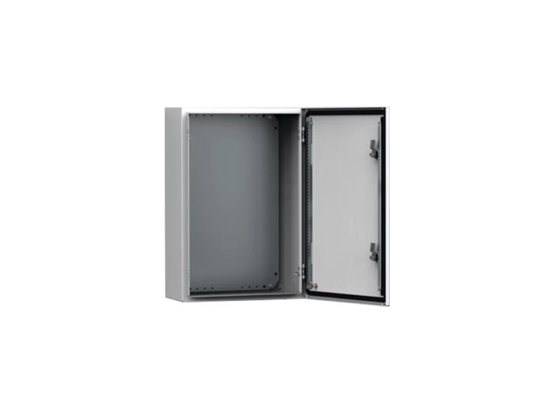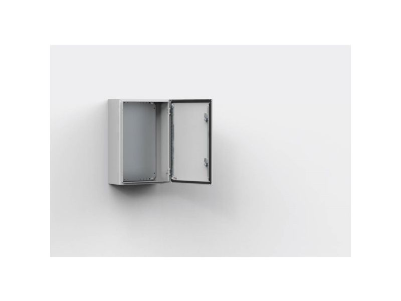 Material: Kabinet: 1,2 mm lakeret stål til skabe med en dybde på 155 mm / 1,4 mm til skabe med en dybde på 210 eller 260 mm / 1,5 mm til skabe med en dybde på 300 eller 400 mm, eller hvis en højde eller bredde er 1000 mm eller større. Flange: 1,4 mm lakeret stål. Dør: 1,2 mm lakeret stål / 1,5 mm for skabe med en højde eller bredde 500 mm eller større / 2 mm til skabe med en højde eller bredde på 800 mm eller derover. Monteringsplade: 2 mm galvaniseret stål. Body: Kantbukket og fuldsvejst. Fire huller 8.5 mm diameter til montering på væg, udpresset i 20.4 mm diameter × 2 mm forsænkninger af hensyn til luftcirkulation bag skabets bagside. Door: Overflademonteret med 130° åbning. Skjulte aftagelige hængsler med låsepind. Hængsler kan monteres til at åbne i venstre eller højre side. Indvendige M6 svejsede studse til montering af dørprofiler MMDP. Sikker tætning med en opskummet polyurethanpakning i et stykke. Lock: nVent HOFFMAN specialdesign dobbelt-bit 3 mm lås med 90° bevægelse o