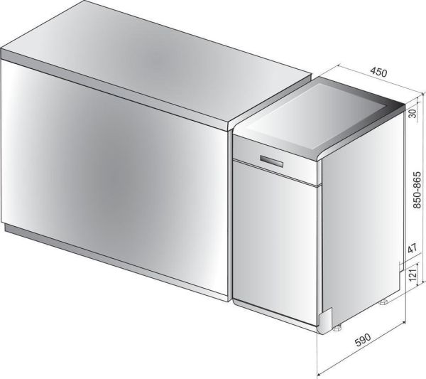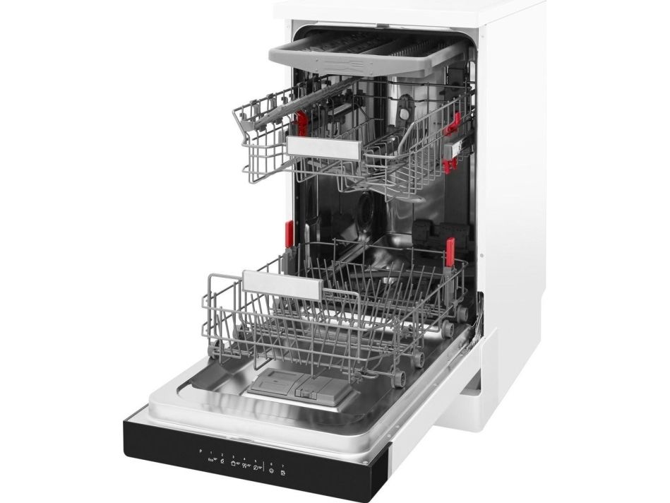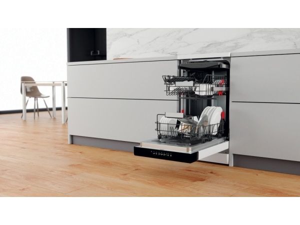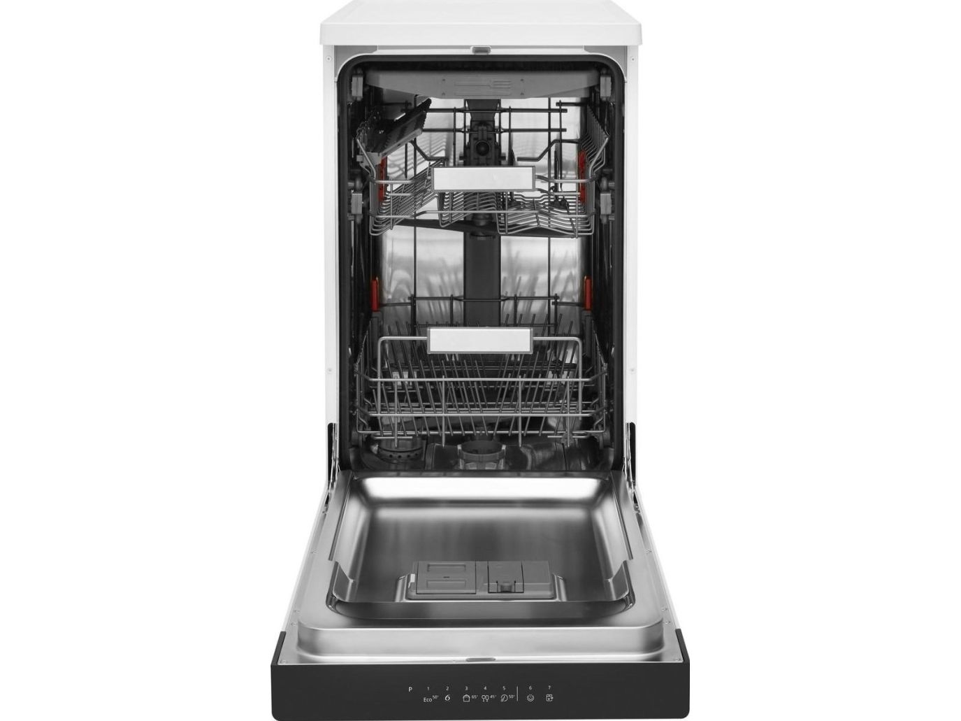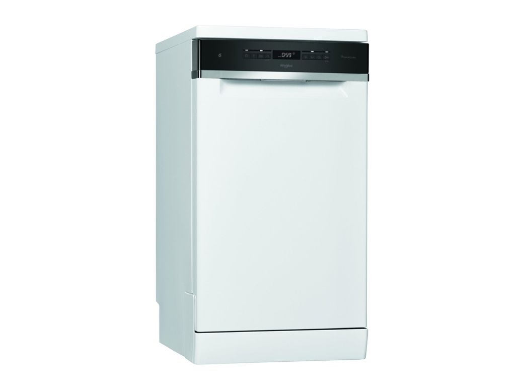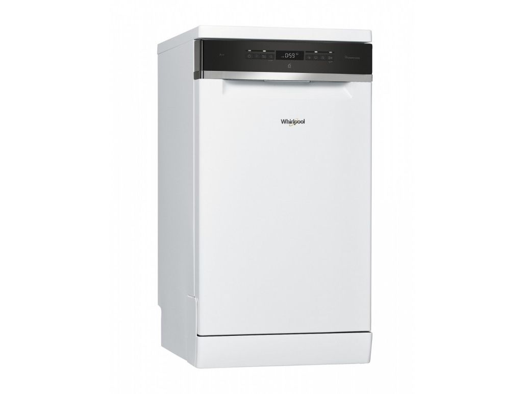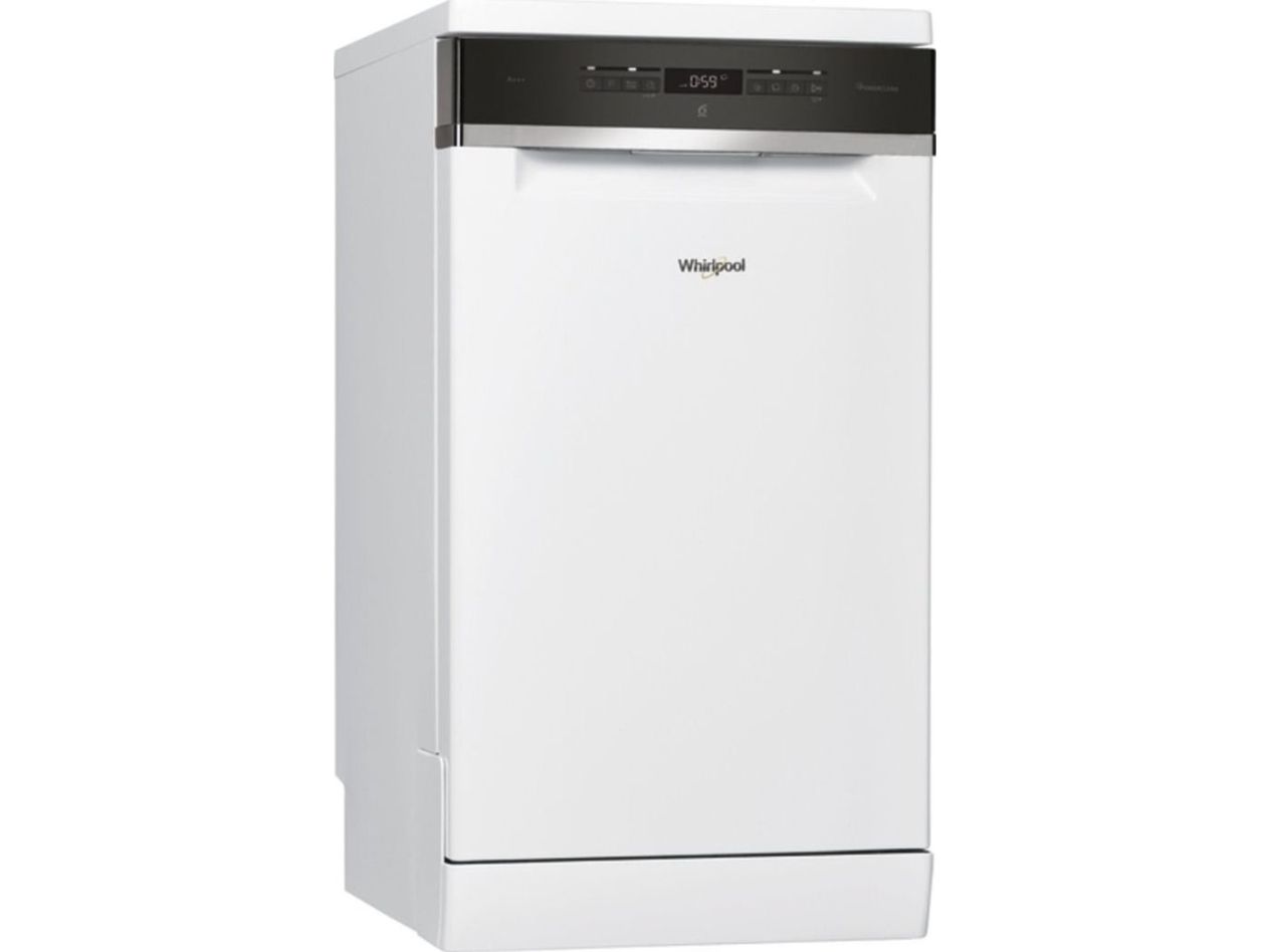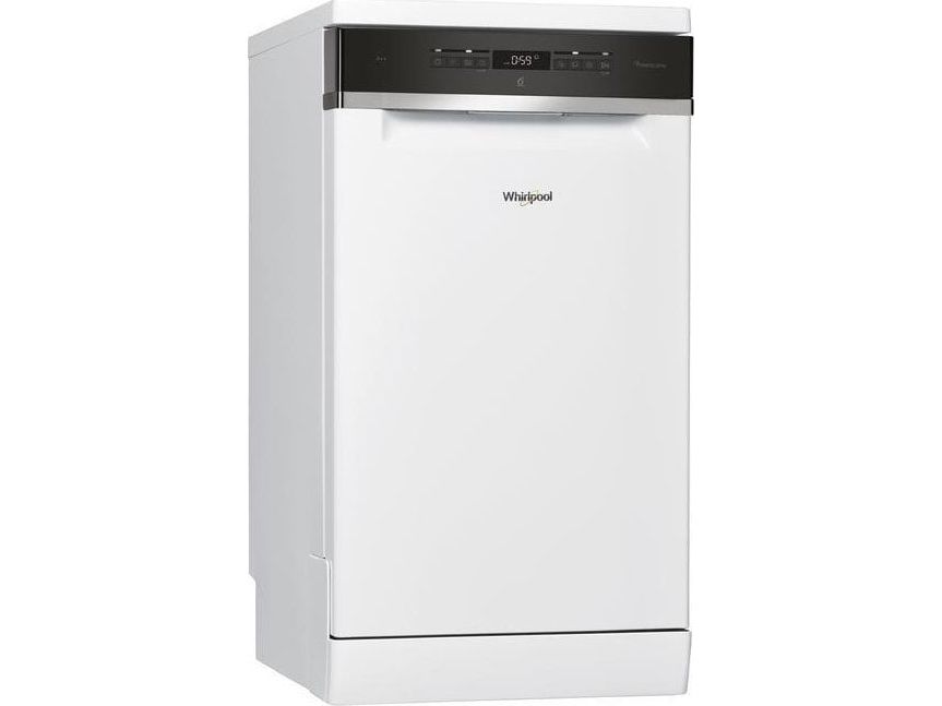 Brand- Whirlpool. Model- WSFO 3023 PF. Width- 45 cm. Depth- 59 cm. Height- 85 cm. Weight- 39.5 kg. Colour- White. Energy Efficiency Class- E. Annual energy consumption- 212 kWh. Water consumption per cycle- 9 l. Number of sets of dishes- 10. Annual water consumption- 2520 l. Dishwasher type- Free standing. Washing efficiency class- A. Drying efficiency class- A. Noise level- 43 dB. Eco program duration- 240 min. Number of applications- 7. Washing programs- Quick wash, Delicate washing, Intensive washing, Pre-rinse. Indicators- Rinse aid indicator, Salt indicator. Control- Electronic. Water spill protection- Yes. Child safety function- Yes. Screen- Yes. Tool drawer- Yes. Automatic opening- No. Mandatory warranty- 24 mo. Postponement of the start of the program- Yes. Adjustable leg height- Yes.