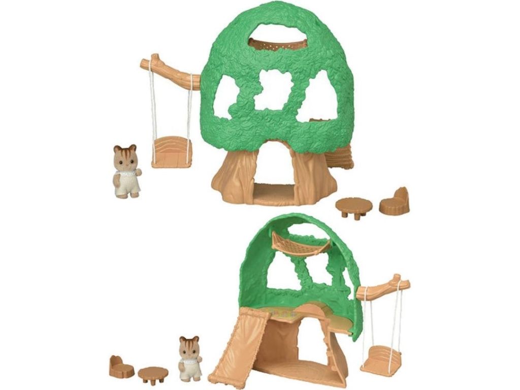 Baby Tree House includes a hammock, slide, and swing, so children can help babies play. They can also be posed to peek out through the leaves.