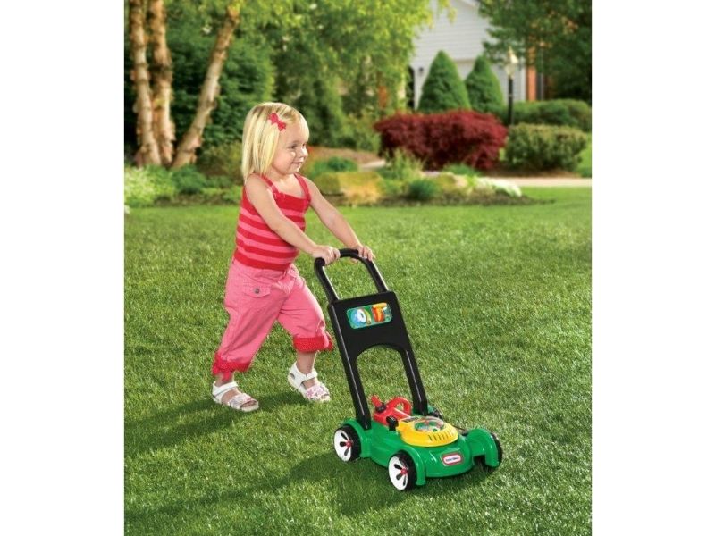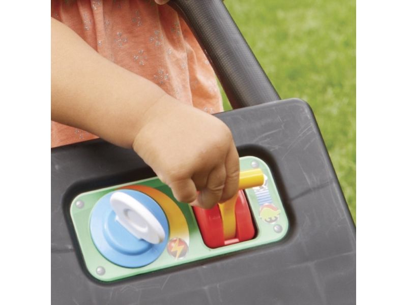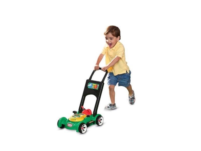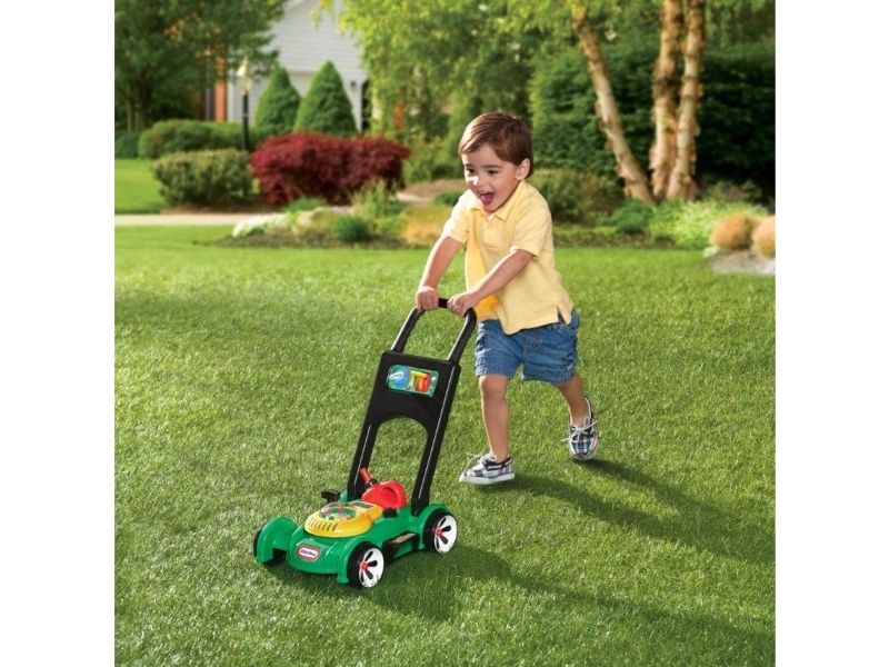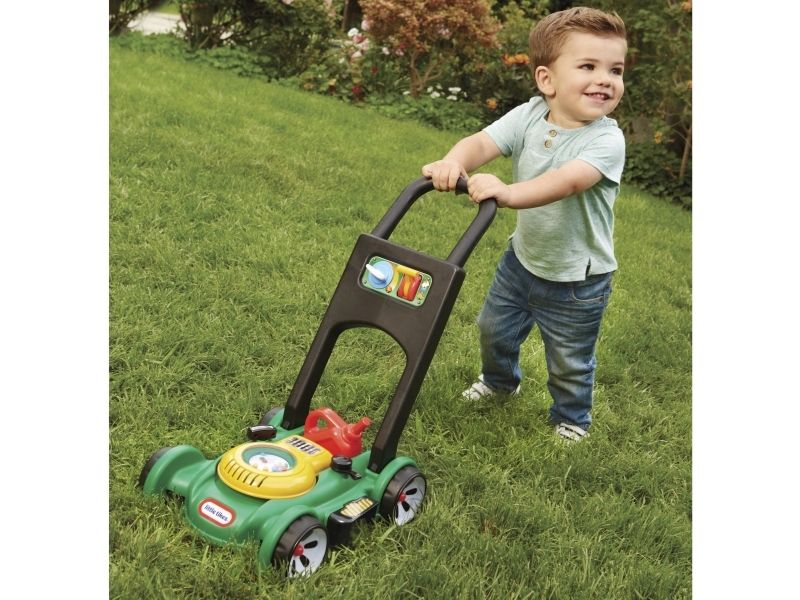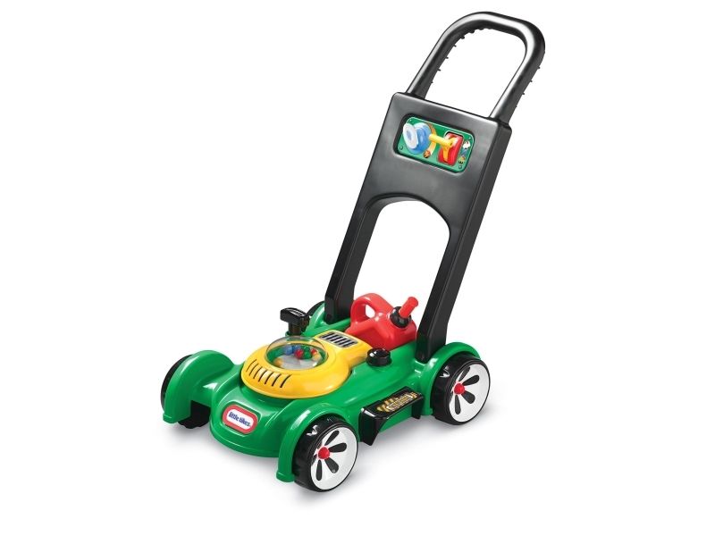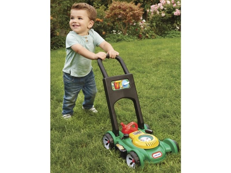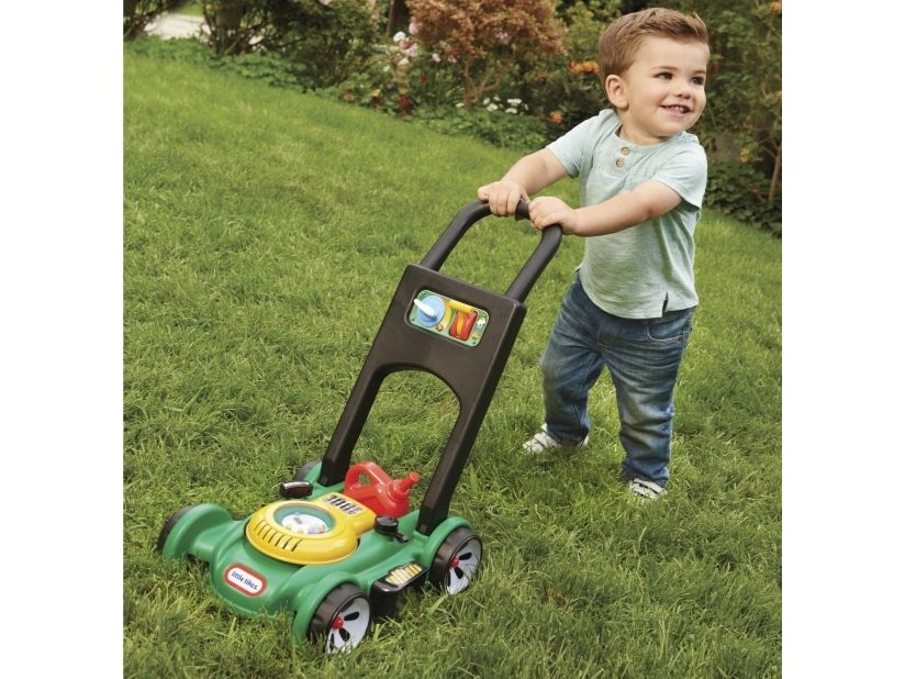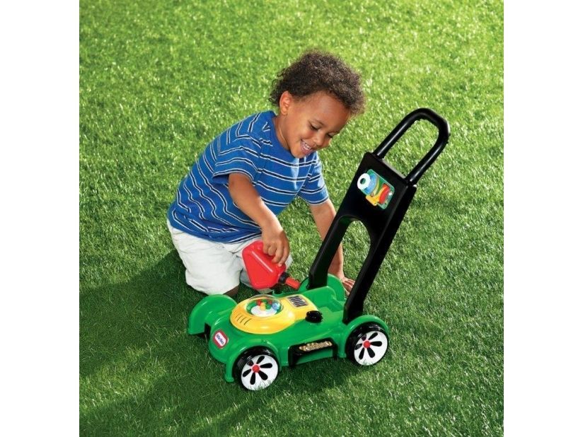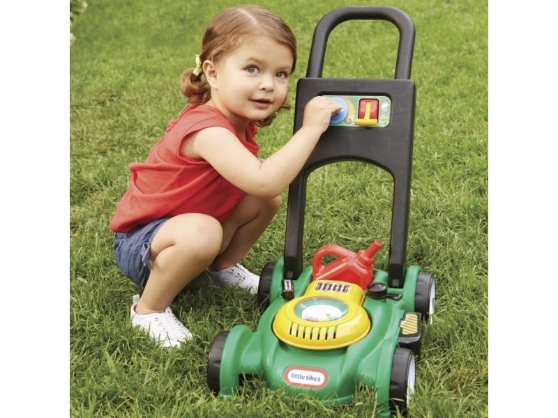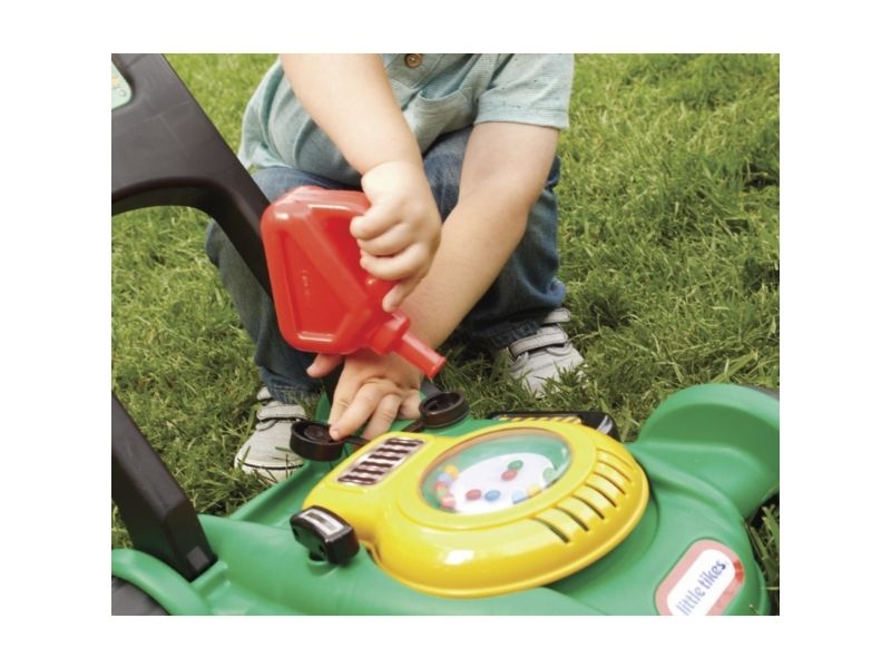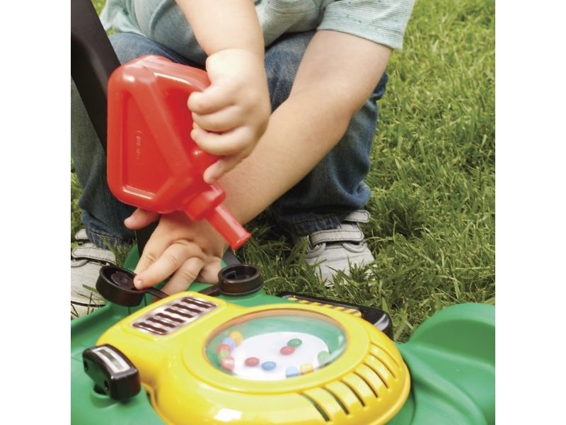 This toy lawn mower lets children mimic the activity they see every day in the world around them. The sounds and hands-on features of this kid’s lawn mower encourage pretend play and get kids moving – and mowing! - Sounds are mechanical, no batteries needed. - Push mower, beads pop as you push. - Pull cord to hear engine sounds. - Clicking key and adjustable throttle. - Removable gas can. Kids can open the tethered gas cap and pretend to fill up the lawn mower.
