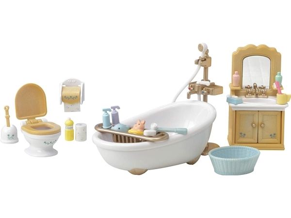 Bath, shower, toilet, sink, laundry basket, bath caddy, bath plug, toilet paper holder, toilet paper (with roll), toilet paper (without roll), detergent bottle, toilet brush, toilet brush holder, bath toy (dolphin), bath toy (bunny), shampoo bottle, conditioner bottle, body brush, body soap, cup, milk lotion, lotion, soap, soap tray, toothbrush (total 25 pieces) *Perfect furniture set for a bathroom *Includes 25 pieces: bath, sink, shower, toilet, and many accessories *Sink has a mirror *Stimulates imaginative role-playing by children *Suitable for ages three years and above