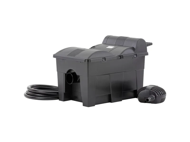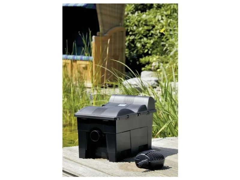 Teichfilter BioSmart Set 14000 Komplettset mit Pumpe optimal auf den Filter abgestimmt. Mit seiner Kombination aus großer Filterschaumfläche und integrierter UVC-Technologie sorgt der OASE BioSmart Filter für klares und gesundes Wasser im Teich. Die bekannten Reinigungsverfahren ermöglichen eine bequeme Reinigung des Filterschaums ohne Demontage. Die eingebaute Verschmutzungsanzeige signalisiert den richtigen Zeitpunkt für die Reinigung. Mit Verschmutzungs- und Wassertemperaturanzeige Der Filter kann zu 1/3 in den Boden eingelassen werden