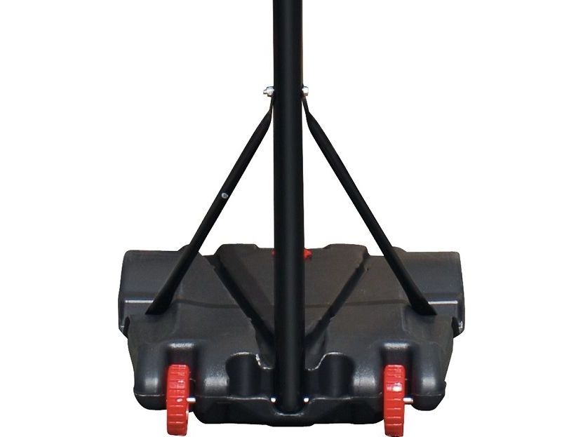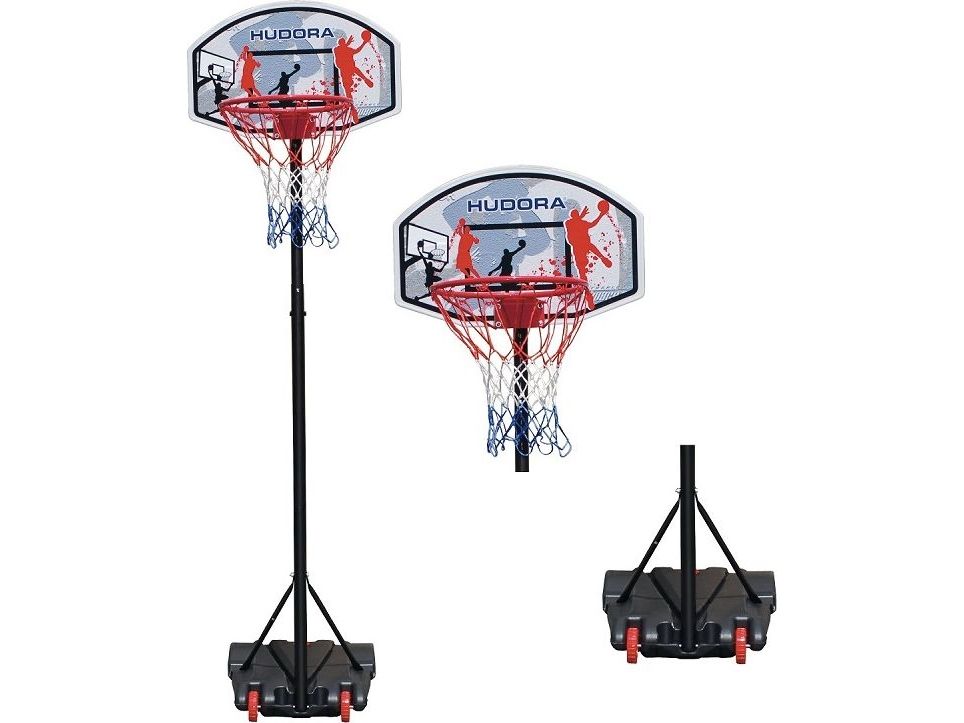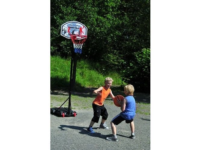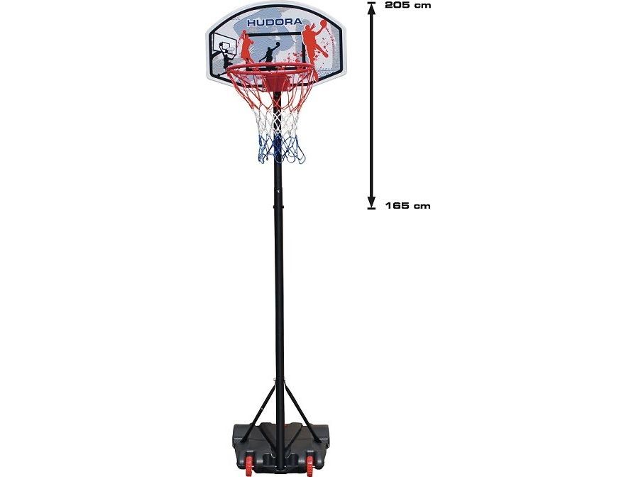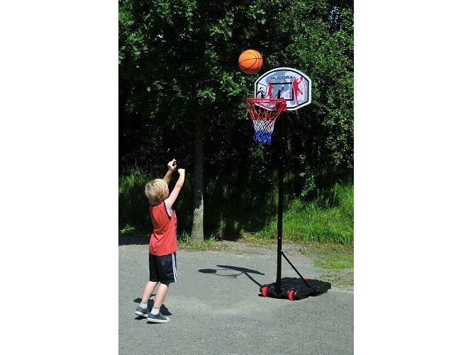 Outdoor Basketballständer für Kinder. Der transportable Ständer für Haus und Garten; beweglich und rollbar durch zwei Räder. Wächst mit, höhenverstellbar von 165 bis 205 cm. Basketballbrett 70 x 45 cm, aus robustem Kunststoff. Basketballkorb, bestehend aus pulverbeschichtetem Metallring in 15,5 mm Stärke und mit 42,5 cm Ringdurchmesser, mit Netzösen und 53 cm langem Netz. Metallstange in 42 - 45 mm Ø, pulverbeschichtet und mit zwei zusätzlichen Spannstangen am Standfuß befestigt. Sicherer Standfuß aus stabilem Vinyl. Wird für optimale Standsicherheit einfach mit Wasser oder Sand befüllt (ca. 27 l).