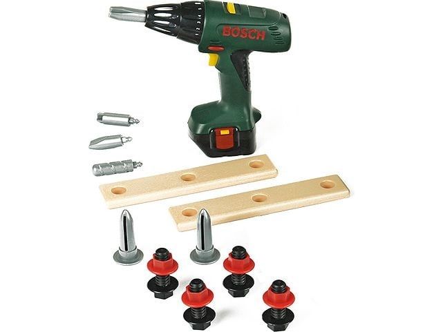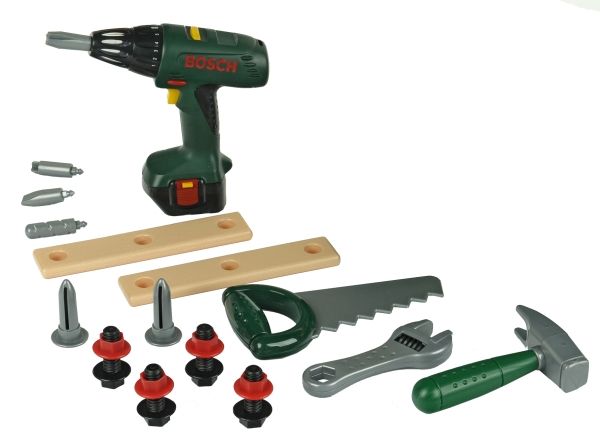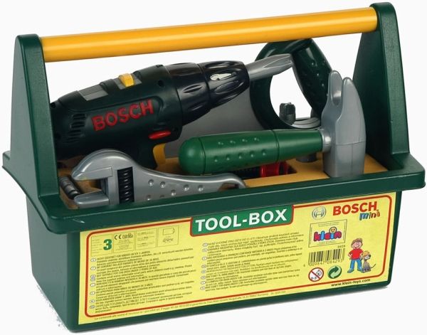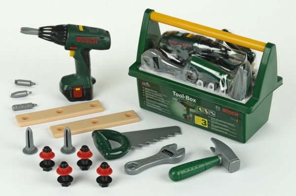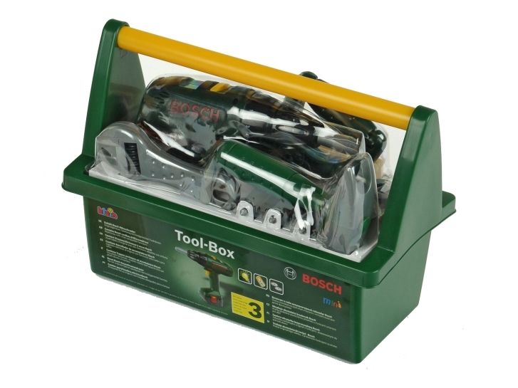 Bosch toolbox with battery operated cordless drill and other tools Battery: R6, 1,5V AA Batteries not includedTheo Klein Bosch tool box. Product colour: Green