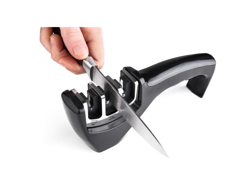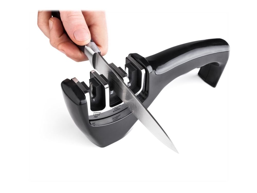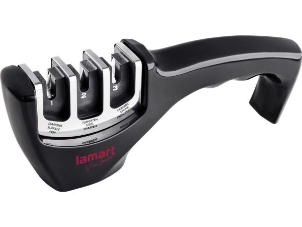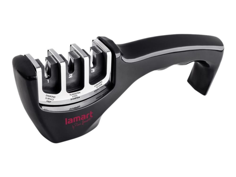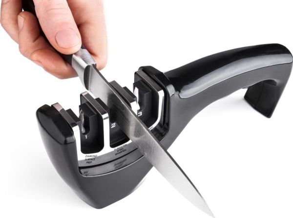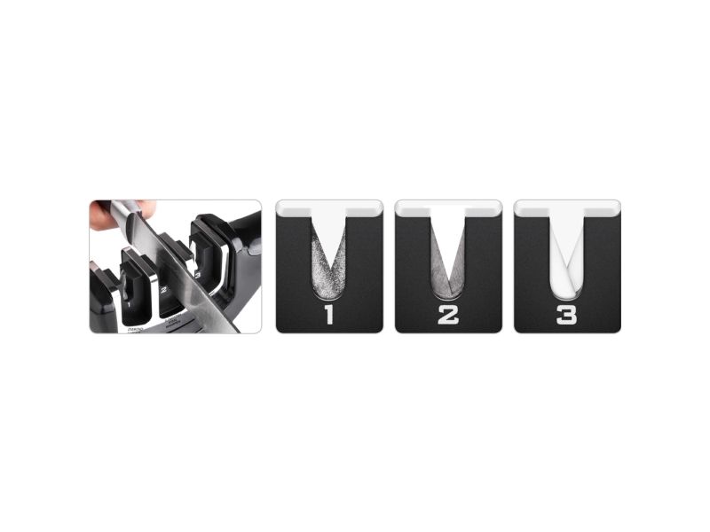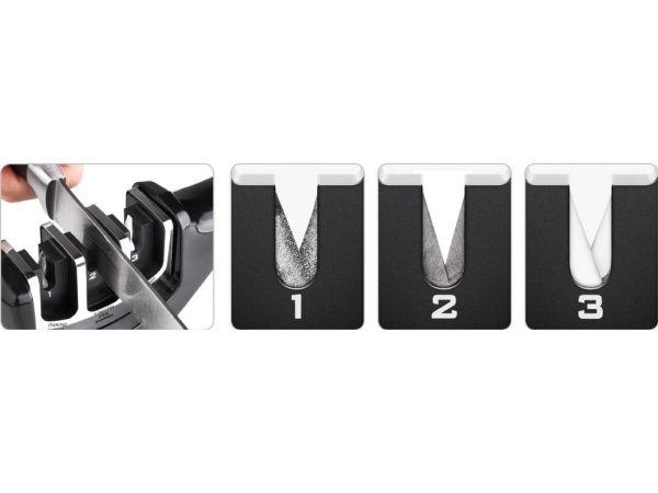 3-stage knife sharpener made from softened ABS plastics with an anti-slip base. Diamond stone for blade repairs and straightening before sharpening, stainless tungsten disc sharpens the edge and restores the "V shape" to the blade and the ceramic stone hones the blade and smooths out all surface irregularities.