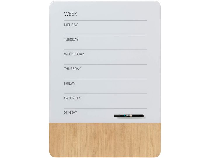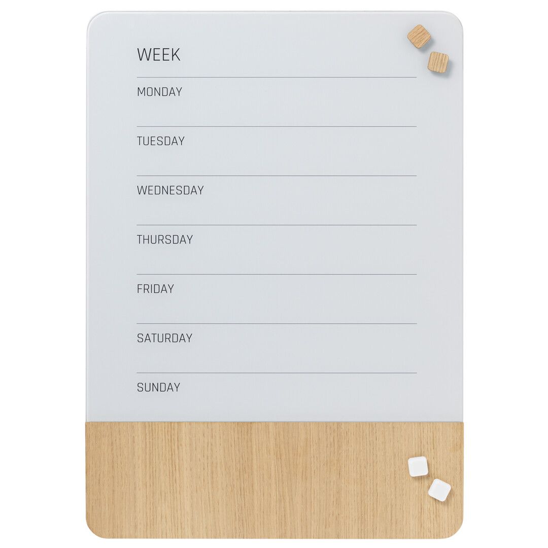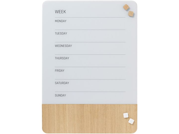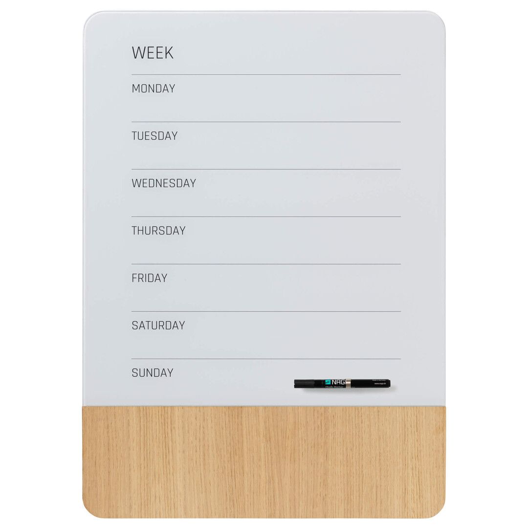 Magnetische Wochentafel 50 x 70 cm. Die Tafel besteht aus einer Kombination von Glas und Furnier, beide Teile sind magnetisch, mit superstarken Magneten kann man Dinge auf die Tafel schreiben. Sobald der Text trocken ist, kann er leicht wieder gelöscht werden, verwenden Sie einen Tafelschwamm oder ein trockenes Tuch.das Furnier Teil ist in natürlichem Material, und daher gibt es natürliche Variationen in der Oberfläche Textur und Farbe. Die Oberfläche wird durch das Licht beeinflusst und verändert im Laufe der Zeit Struktur und Farbe des Brettes, das in einer Geschenkbox geliefert wird.