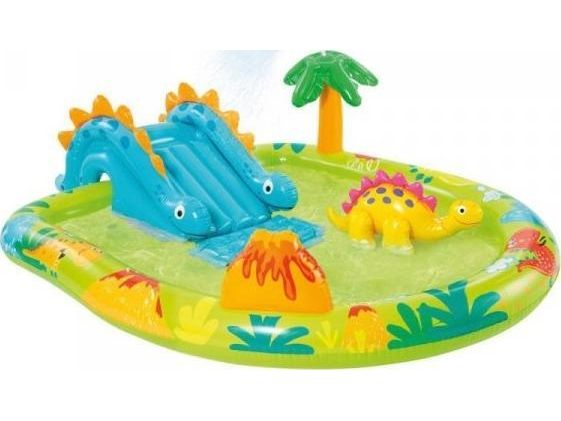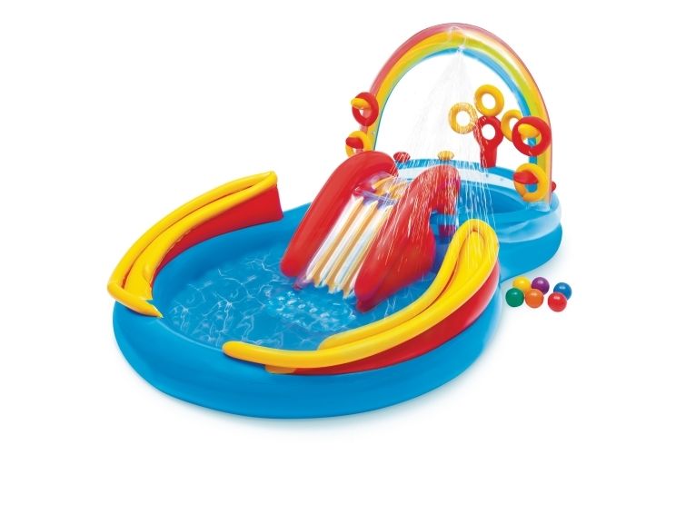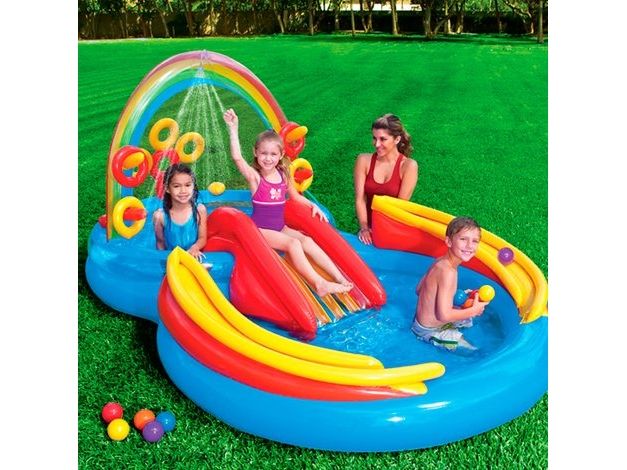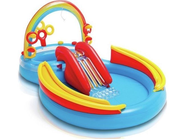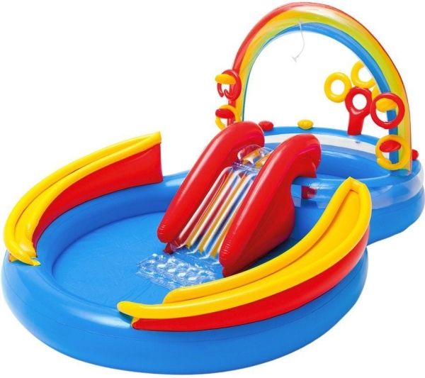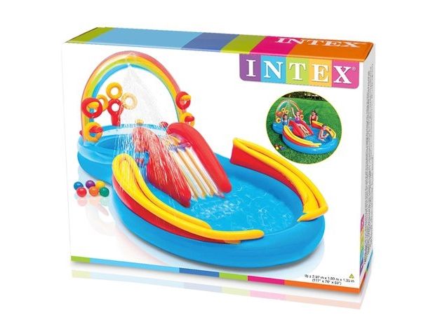 Transform your backyard into the favorite neighborhood hangout this summer with the Intex Rainbow Ring Play Center. You will love the Slippery Water Slide, Raging Ring Toss Game (iincludes 4 inflable rings) , and all the Super Fun Ball Games (incl. 6 8 cm balls) included in this mini Water Park. The pool measures 297 x 193 x 135 cm inflated. The wading pool fills to 20 cm wall height with 175 litres of water, and the main pool fills to 14 cm of wall height with 206 litres. With drain plug, and includes 1 repair patch. From 24 months, under adult supervision.