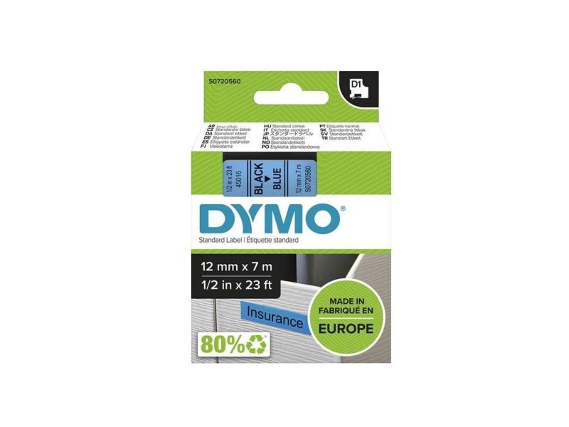 DYMO Original D1-Etikettenband | schwarz auf blau | 12 mm x 7 m | selbstklebendes Schriftband | für LabelManager-Beschriftungsgerät, Scwarz auf blau, Polyester, Belgien, -18 - 90 °C, DYMO, LabelManager, LabelWriter 450 DUO
