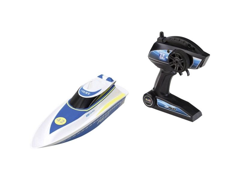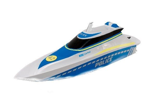 Hier haben Verbrecher keine Chance! Mit dem schnellen und wendigen Polizeiboot kontrollierst du die Gewässer. Zwei Elektromotoren und der integrierte Li-Ion Akku liefern die nötige Power und eine lange Fahrzeit. Dank des mitgelieferten USB-Ladegeräts bist du jederzeit wieder einsatzbereit. Die komplett gekapselte Elektronik ist auch bei wilden Fahrmanövern vor eindringendem Wasser geschützt. Durch die 2.4 GHz Technologie kannst du mit mehreren Freunden gleichzeitig Boote steuern, ohne dass ihr euch gegenseitig stört. Die enthaltende Schutzschaltung verhindert das Anlaufen der Propeller außerhalb des Wassers. So besteht keine Verletzungsgefahr. 15 Min Fahrspass durch Li-Ion Batterie und USB-Ladekabel. Ergonomische Pistolen-Fernsteuerung für schnelles und wendiges Manövrieren. Im Police-Design mit 2 Elektromotoren und komplett gekapselter Elektronik. 2 x 1,5V AA Batterien benötigt / nicht enthalten.