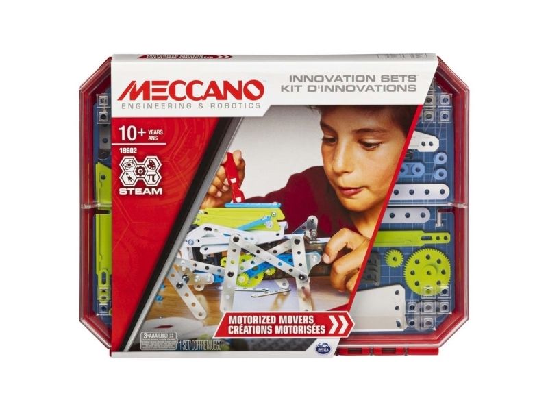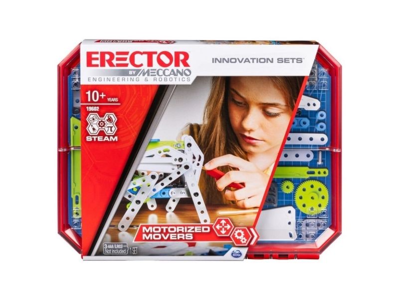 Meccano-Set mit Motor, mit dem Sie motorisierte Konstruktionen bauen können. Das Set wird mit einer Anleitung und sechs doppelseitigen Modellzeichnungen geliefert.