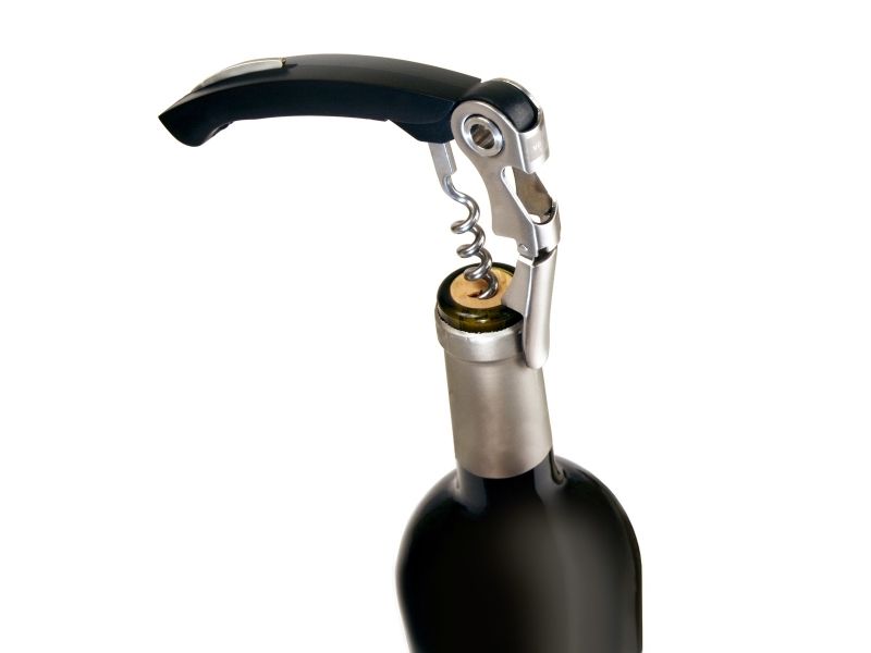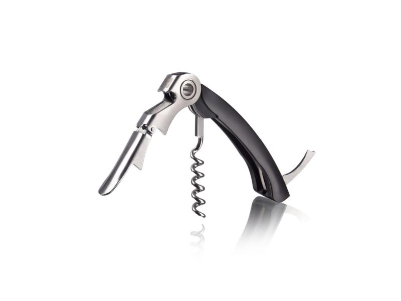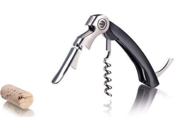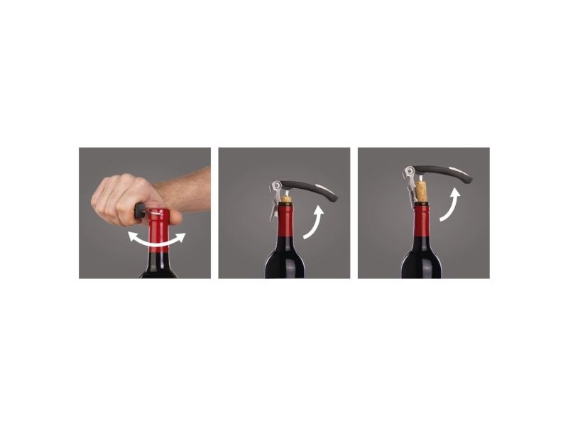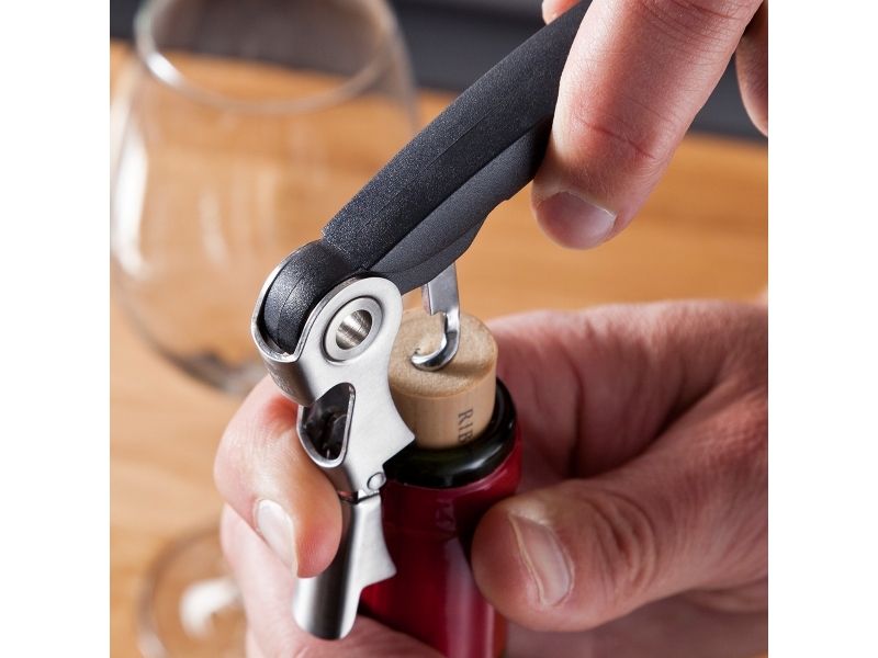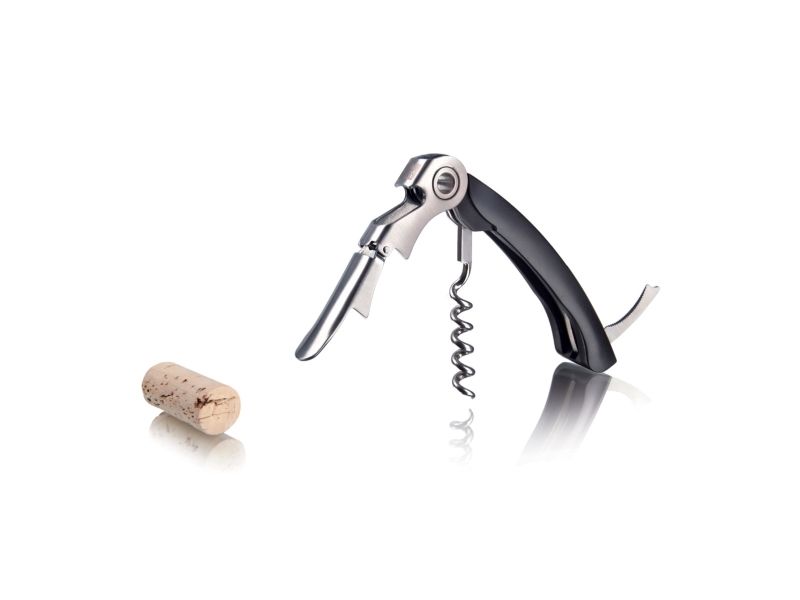 The Double-hinged corkscrew uses its hinge mechanism with a twostep motion.to open a bottle quick and effortless. Because of its compact and lightweight design. The Double-hinged Corkscrew.Includes a built-in foil cutter and crown cork opener.is easy to carry around and easy to store in your drawer.