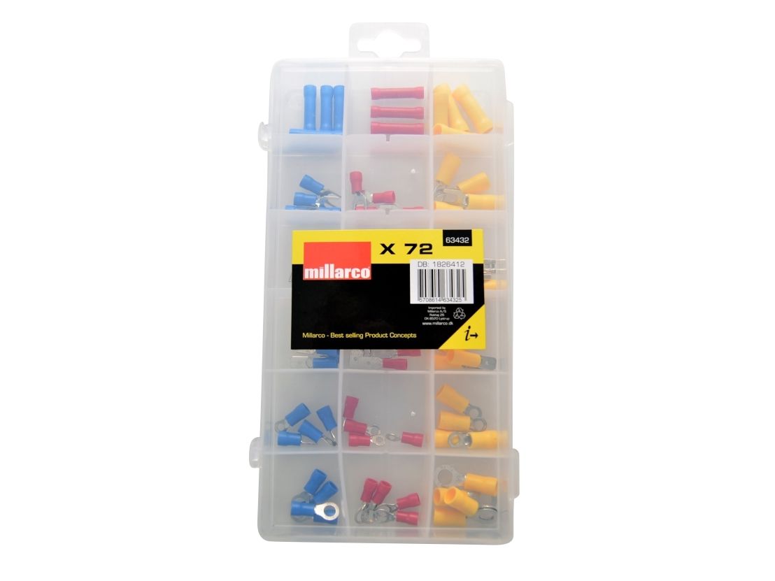 Packung mit 72 Stück verschiedener Kabelschuhe, in Industriequalität mit hoher Leitfähigkeit und Schutzisolierung, damit Sie immer das richtige Teil zur Hand haben. 24 x Ringverbinder 12 x Endverbinder 12 x Flachstecker 12 x Endstecker 12 x Endbuchsen