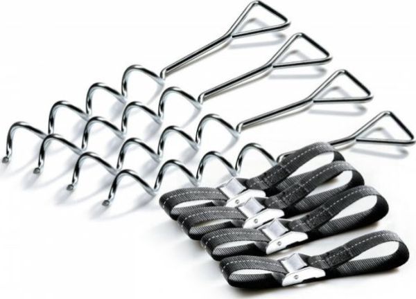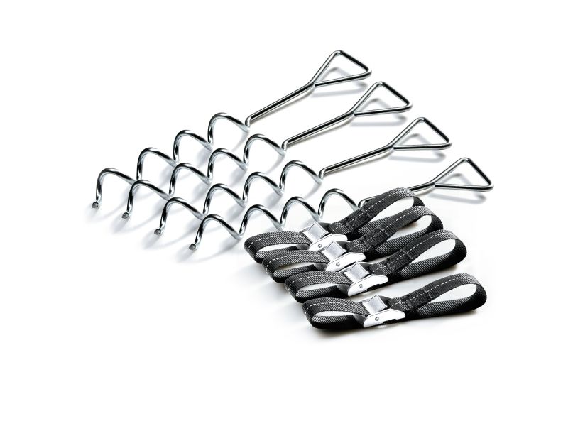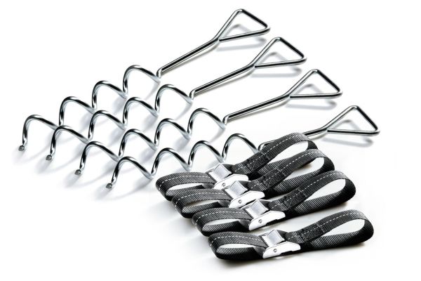 A simple turning system Due to the spiral shape, the anchors are easy to turn in the soil and suitable for both soft and hard soil types. The set consists of 4 galvanized ground anchors (L43 cm Ø8 mm), with 4 weather-resistant polyester straps on a robust cast iron buckle.