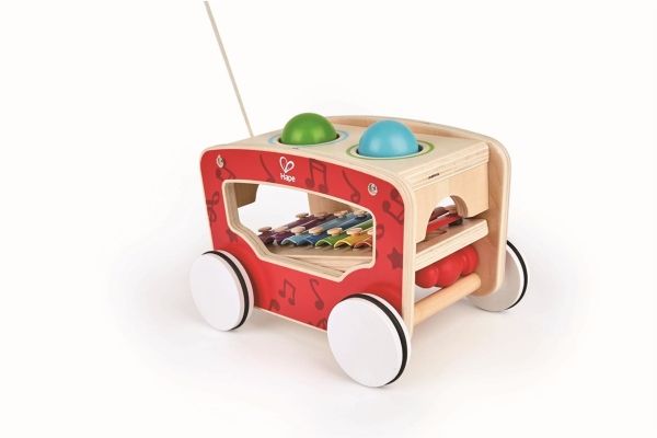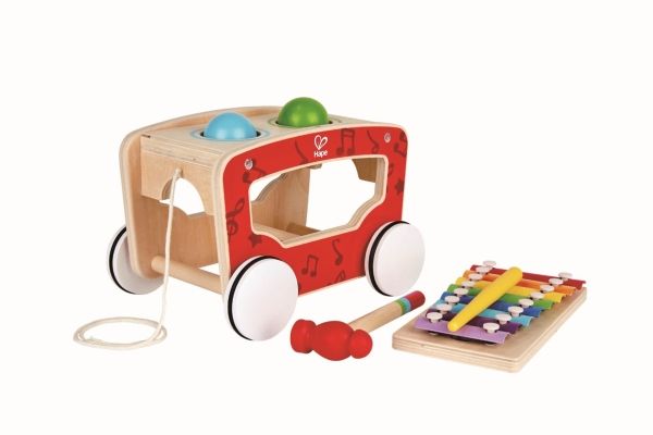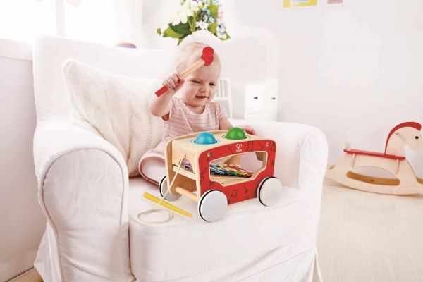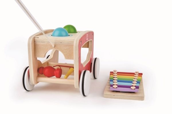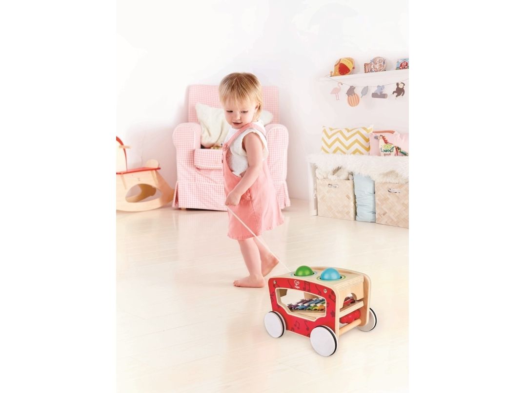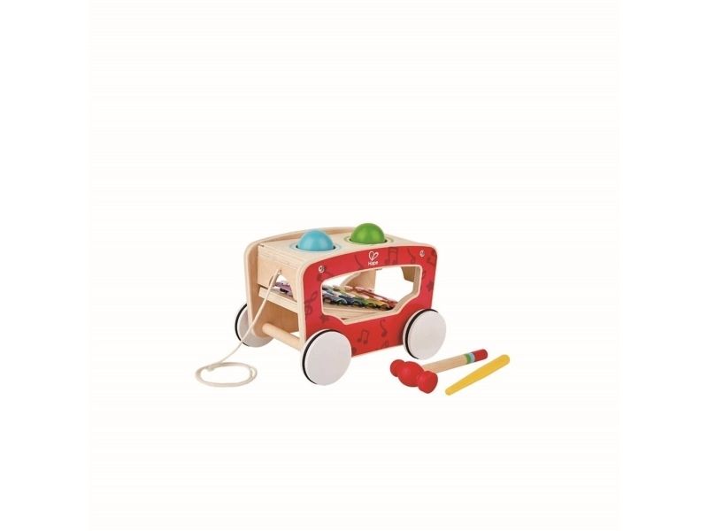 Mit dem Aktivitätswagen von Hape ist endloses Spielen möglich - und das Spiel kann überallhin mitgenommen werden! Der Wagen enthält Holzkugeln, einen Hammer und ein Xylophon, und alles kann transportiert werden. Mit den Holzkugeln kann einzeln gespielt werden, oder man kann sie durch die Löcher klopfen - welche Töne schlagen sie, wenn sie auf das Xylophon fallen? Das Xylophon ist in sechs verschiedenen Farben erhältlich, so dass Ihr Kind nach und nach die Farben erlernen und schließlich Musik damit machen kann.