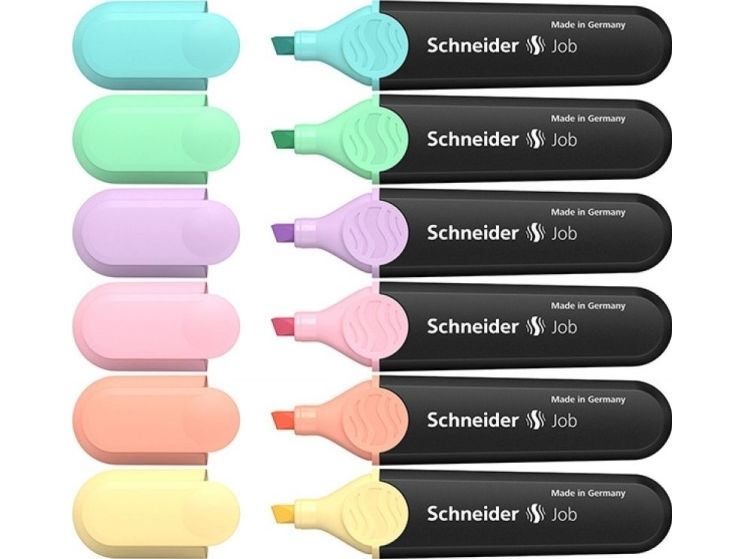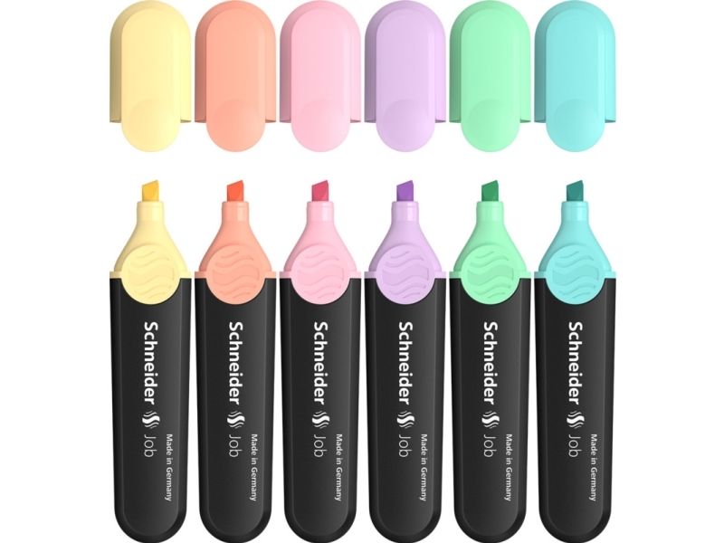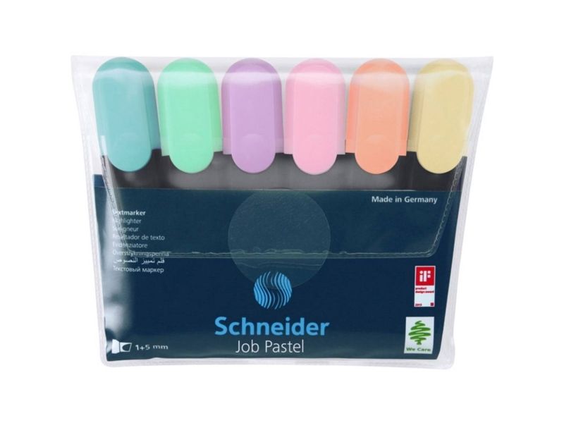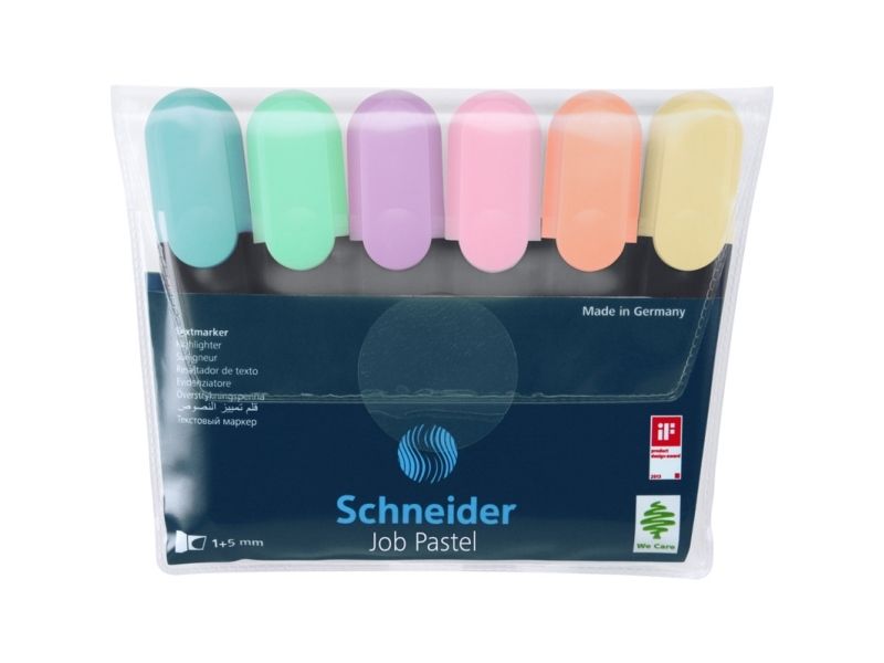 Highlighter with chisel tip for two line widths, 1+5 mm.Wallet with 6 pieces: each 1 x turquoise, mint, lavender, light pink, peach, vanilla. The universal ink presents maximum brilliance and good lightfastness on normal, copying, and fax paper. The anti-evaporation polypropylene barrel is guaranteed to keep the highlighter fresh for 2 years. The smart highlighter features brilliant performance and was awarded the renowned iF and red dot design awards in 2013. The slimmer shape with rounded edges is perfect for sticking in one's pocket or pencil case. The cap has a clip and fits neatly on the end of the barrel. With its large ink reservoir, the Job pen can highlight over 15,000 words.