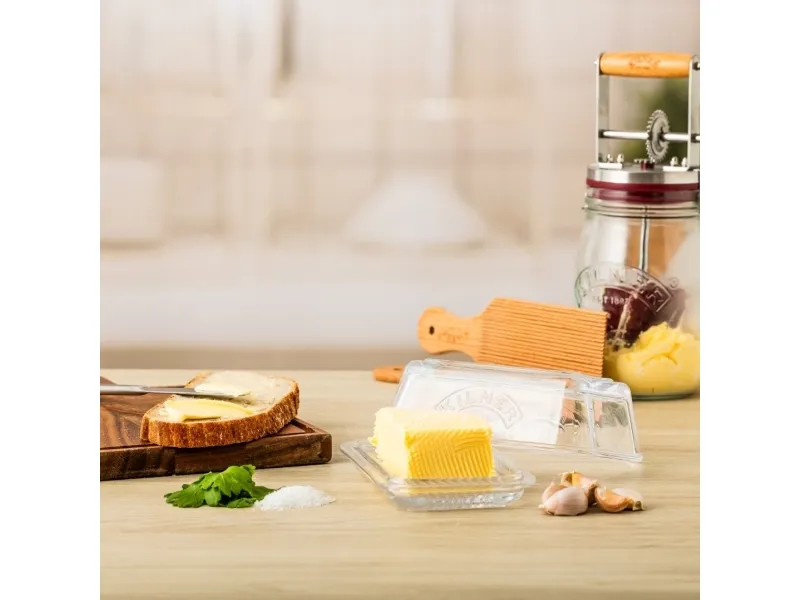 The classic Kilner® Butter Dish, embossed with the Kilner® logo and the word ‘butter’, is an essential item for any kitchen. Perfect for storing butter in the fridge or serving it at the dining table. The elegant design complete with lid will keep butter fresh. Fits up to 250g.
