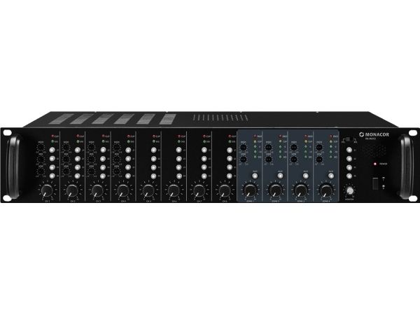 4-zone PA matrix mixing amplifier;#120 W per zone;#4 zones, can be controlled individually with 2-way tone control;#Class D concept with a high efficiency to cut energy costs;#4 adjustable mic/line inputs with 3-way equalizer and 24 V phantom power, to be activated as required;#4 adjustable line inputs;#Mute function for muting individual zones;#Connection for external mute switch (all zones simultaneously);#Talkover (channel 1);#Adjustable monitor function;#1 connection for zone paging microphone PA-M4RC;#4 connections for wall module PA-M1WP;#482 mm (19") rack installation;;Manufacturer information:;MONACOR INTERNATIONAL GmbH & Co. KG Konsul-Smidt-Str. 68 28217 Bremen Germany [email protected];Safety Notes and Warning Messages;The unit uses dangerous mains voltage. Leave servicing to skilled personnel only and do not insert anything into the air vents. Inexpert handling may result in electric shock. During operation, there may be a hazard of contact with a dangerous voltage of up to 100 V at the speaker terminals. Always switch off the amplifier before making or changing any connections. Do not operate the unit and disconnect the mains plug from the socket immediately if the unit or the mains cable is visibly damaged; if a defect might have occurred after the unit was dropped or suffered a similar accident, if malfunctions occur. In any case, the unit must be repaired by skilled personnel. The unit is suitable for indoor use only. Protect it against dripping water and splash water, high air humidity and heat (admissible ambient temperature range: 0 - 40 °C). Never pull the mains cable to disconnect the mains plug from the socket, always seize the plug. The heat generated inside the unit must be dissipated by air circulation; never cover the air vents of the housing. If the unit is to be put out of operation permanently, take it to a local recycling plant for a disposal which is not harmful to the environment.