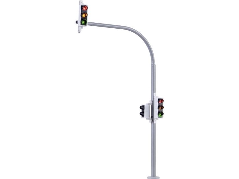 H0 Ampel mit Fußgängerampel und LEDs, 2 Stück Ampeln im Stil der Epoche III - VI. Diese Sets bestehen aus je 2 Ampeln mit einer roten, gelben und grünen LED für die Straße und einer roten und grünen LED für Fußgänger. Sie dienen zur Absicherung von Fußgängerüberwegen wie z.B. Zebrastreifen. Realistischer Messingmast mit Stecksockel für eine besonders einfache Montage. Wartungsfrei dank LED-Beleuchtung Über die mitgelieferte Elektronik werden beide Ampeln in einem festen Wechselrhythmus gesteuert. Höhe: 7,8 cm