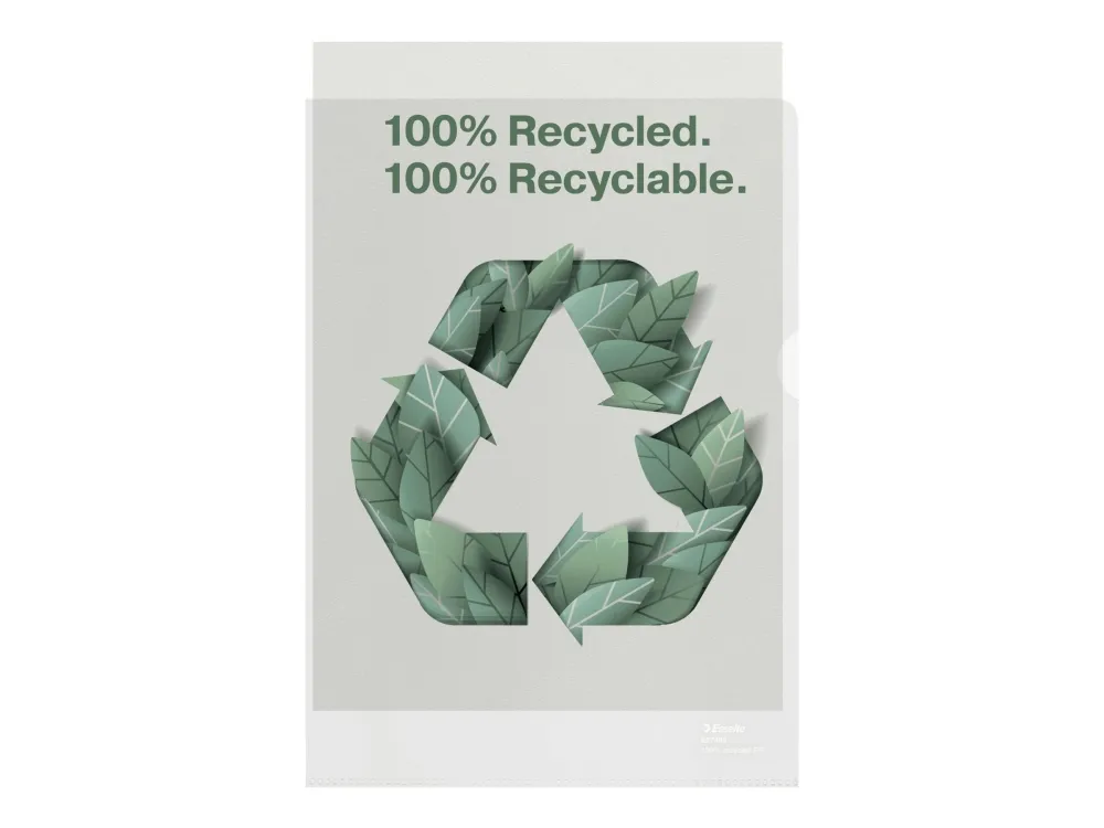 Miljøvenlig A4-dokumentomslag til daglig brug lavet af stærk 100% genanvendt PP. Til beskyttelse af dokumenter på farten og organisering af dokumenter på arbejde og derhjemme. Hele produktet kan genbruges og genanvendes igen. Omslagene er pakket i en papæske, som også er 100% genanvendt og genanvendelig. Fremstillet i Europa. Genanvendt indhold bekræftet af UL. - A4 omslag til at bære, beskytte og præsentere dokumenter med nem adgang til indhold takket være top og højreside åbning - Fremstillet i 100% genanvendt ikke-giftig plast (PP), og hele produktet er 100% genanvendeligt - Holdbar og langtidsvarende premium kvalitet sikrer, at de kan genbruge gang på gang - Ideel organisering af papirer under rejsen, da de optager lidt plads og er lette til få til at passe i laptop taske eller rygsæk - Format A4 med top og højreside åbning, ideel til brug på kontoret, hjemmekontoret eller i skolen - Præget, mat overflade med premium kvalitetsfolie i 100 micron tykkelse - Copy safe folie forhindr