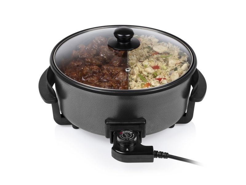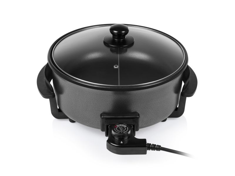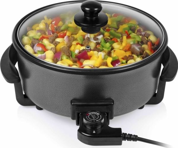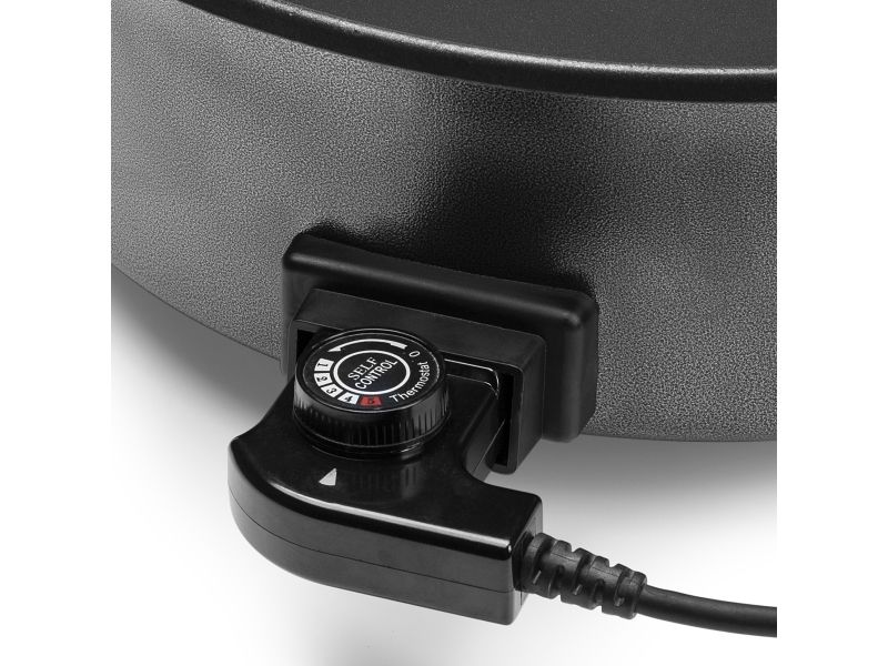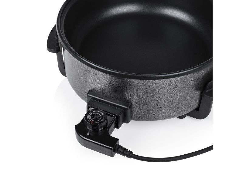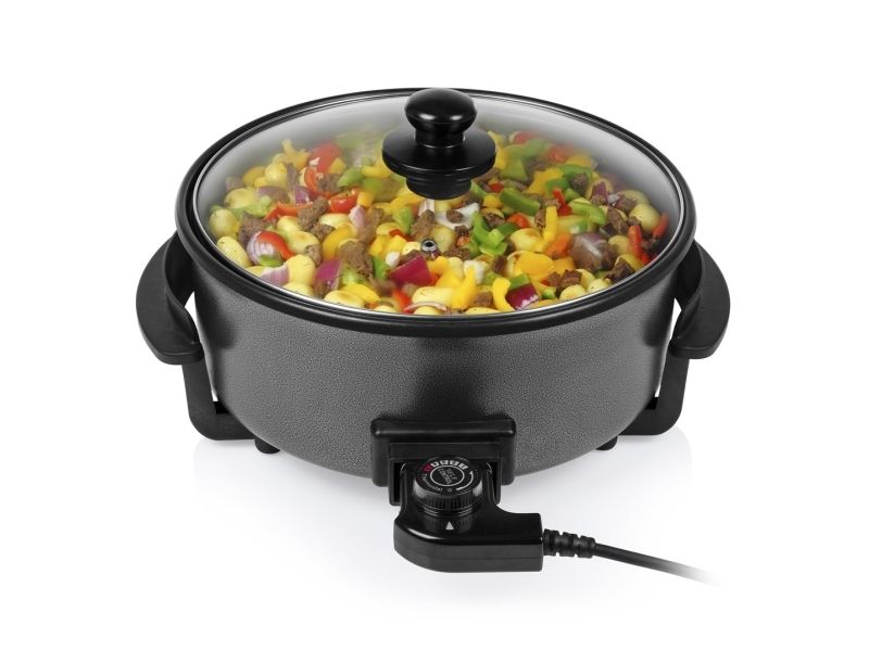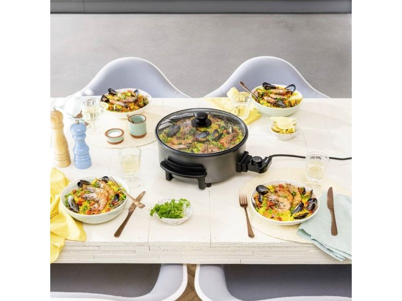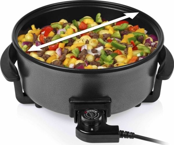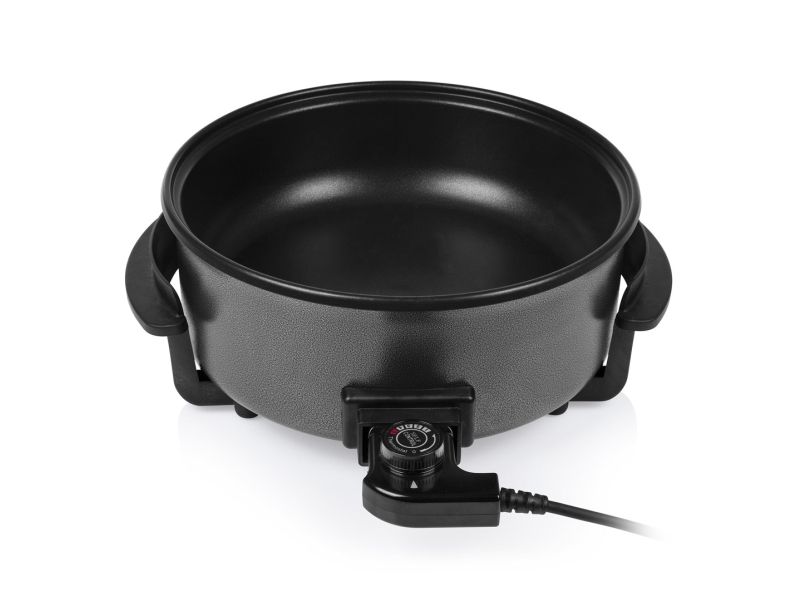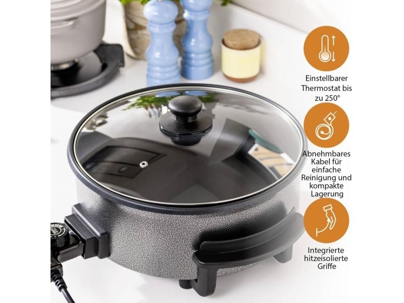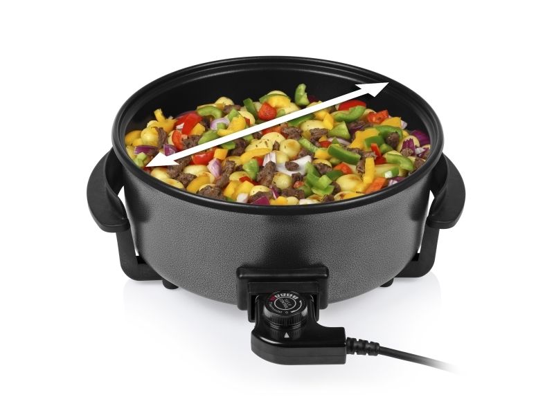 Diese multifunktionale Pfanne hat ein großes Fassungsvermögen, mit 30 cm ? und einer Höhe von 9 cm. Die gewünschte Temperatur kann per Thermostat eingestellt werden. Das mitgelieferte Zubehör teilt die Backfläche problemlos in 2 Fächer.