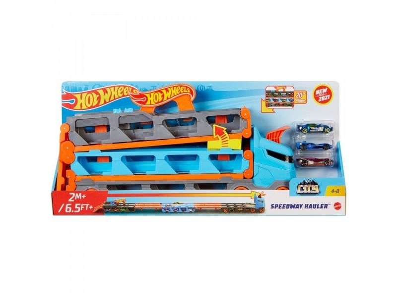 ?The Hot Wheels Speedway Hauler redefines Hot Wheels storage and racing in one very cool semi-truck that's full of surprises. Small display windows on the trailer showcase the more than 20 Hot Wheels cars it can carry, and when kids pull the back latch, the hauler unfolds into a six-foot long racetrack! Unused cars stay visible under the track, while the truck's cab converts into a dual launcher that sends two cars in an epic head-to-head battle. The winner continues onto the next adventure with tracks that connect to other Hot Wheels City sets (sold separately). The multifunctioning vehicle comes with three 1:64 scale Hot Wheels vehicles and can hold up to 19 more (sold separately). It provides endless fun for kids 4 to 8 years old. Colors and decorations may vary.