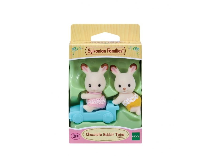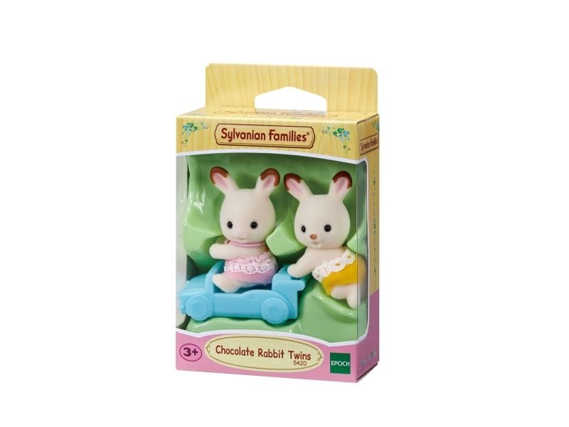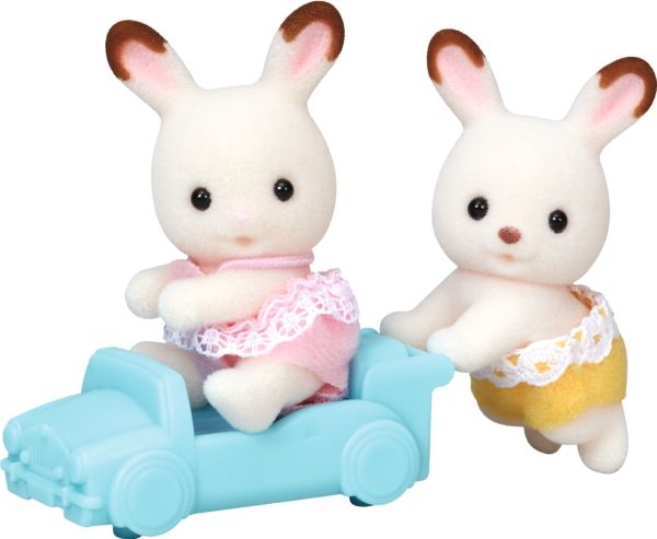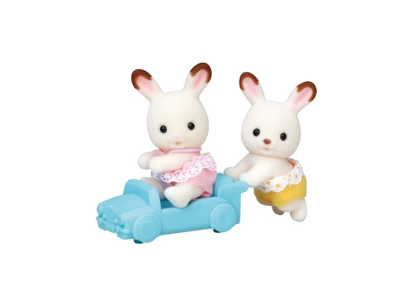 The Chocolate Rabbit Twins set includes the Chocolate Rabbit twins figures (one sitting and one crawling) and a ride-on toy. The figures can be posed by moving the head. Chocolate Rabbit Twins' heads can turn. The sitting Chocolate Rabbit Twin can fit inside the ride-on toy. Put crawling Chocolate Rabbit Twin's hand on the ride-on toy to act out play pushing. The crawling Chocolate Rabbit Twin is a baby boy. He's curious about everything and will crawl absolutely everywhere. The sitting Chocolate Rabbit Twin is a baby girl. She enjoys quietly looking at flowers and butterflies. Use together with Chocolate Family and Chocolate Rabbit Baby (sold separately) for more delightful fun as a family of seven. Mix and match with other homes, furniture, or figures (sold separately) for imaginative playtime. Or hang out with other Twins with ride-on toys (sold separately) to simulate group outings!Chocolate Rabbit Twin (sitting), Chocolate Rabbit Twin (crawling), Ride-on Toy (Car, Blue) (a total of 3 pieces)
