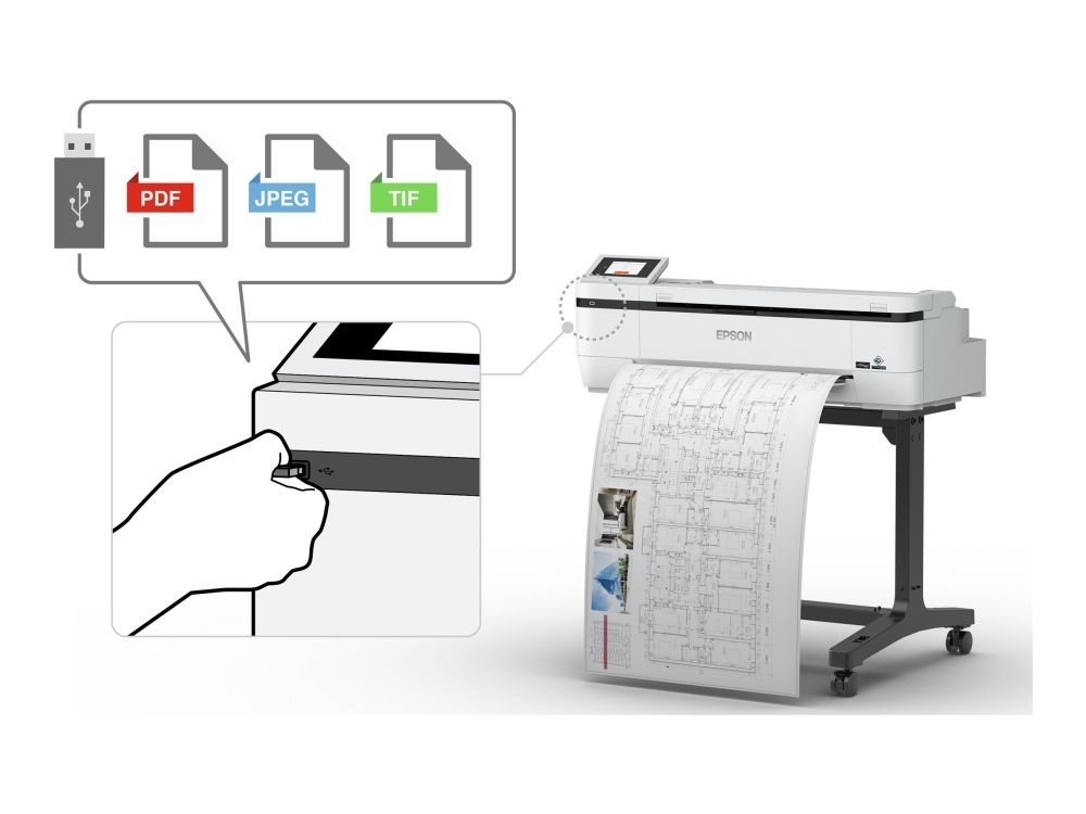 Multifunktional Dieser 24-Zoll-Großformatdrucker (61cm/A1+) wurde speziell für Präzision und detaillierte Wiedergabe entwickelt. Drucken und scannen Sie mühelos und detaillierte technische Zeichnungen, Entwurfszeichnungen, Poster für den Einzelhandel und allgemeine Dokumente. Der SureColor SC-T3100M verfügt über einen integrierten CIS-Scanner mit 600 dpi, der Replikate von Dokumenten mit einer Länge von bis zu 2,7 Meter präzise in unterschiedlichen Dateiformaten erstellt und an verschiedene Ziele sendet sowie Originalkopien skaliert.