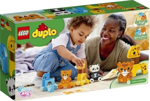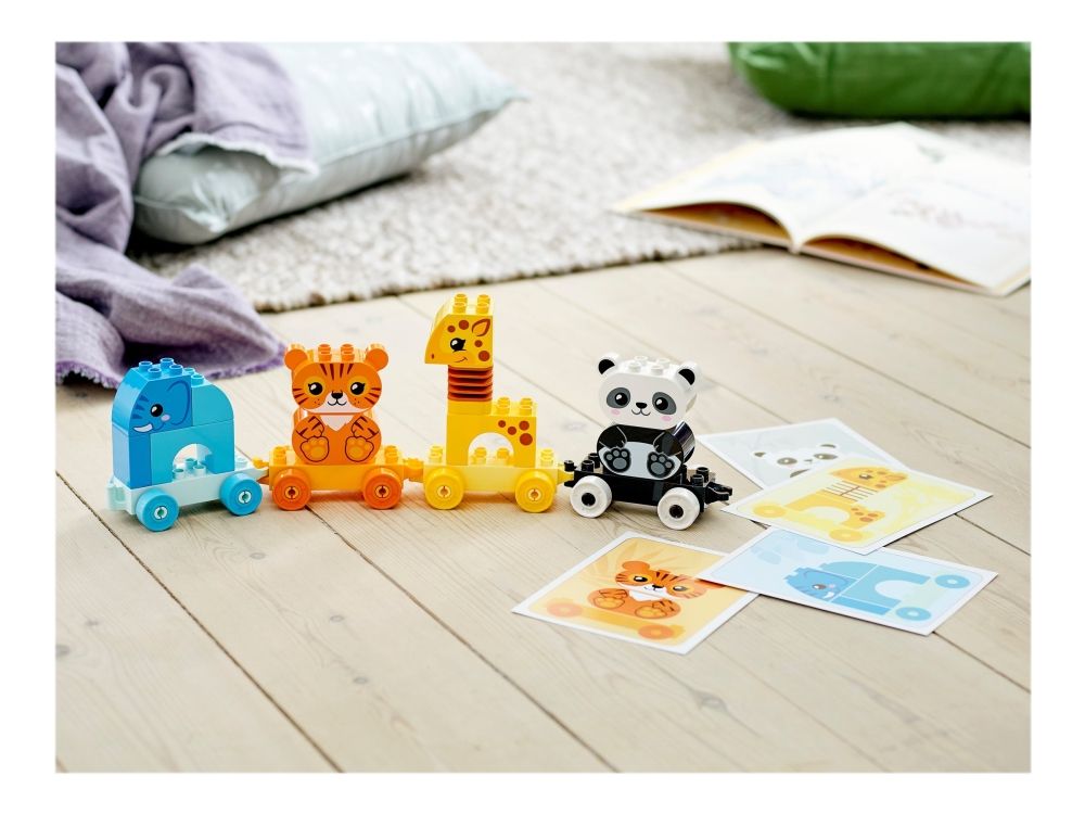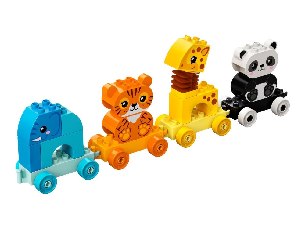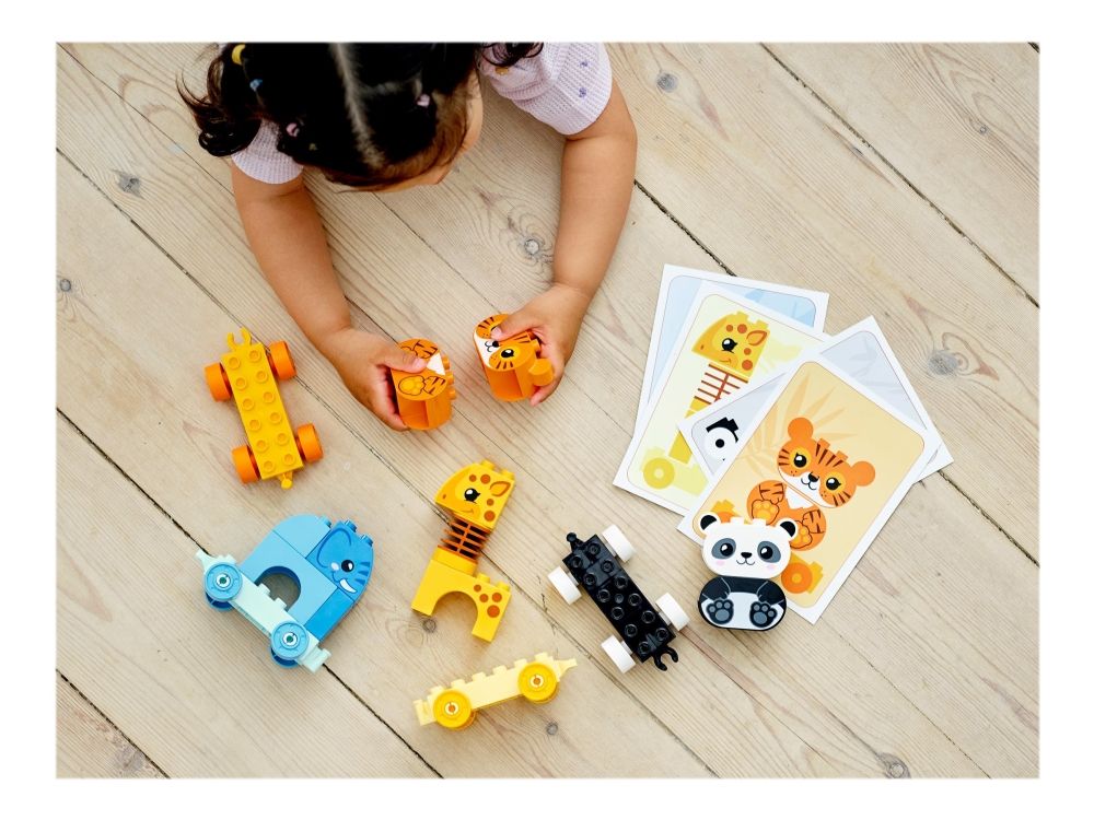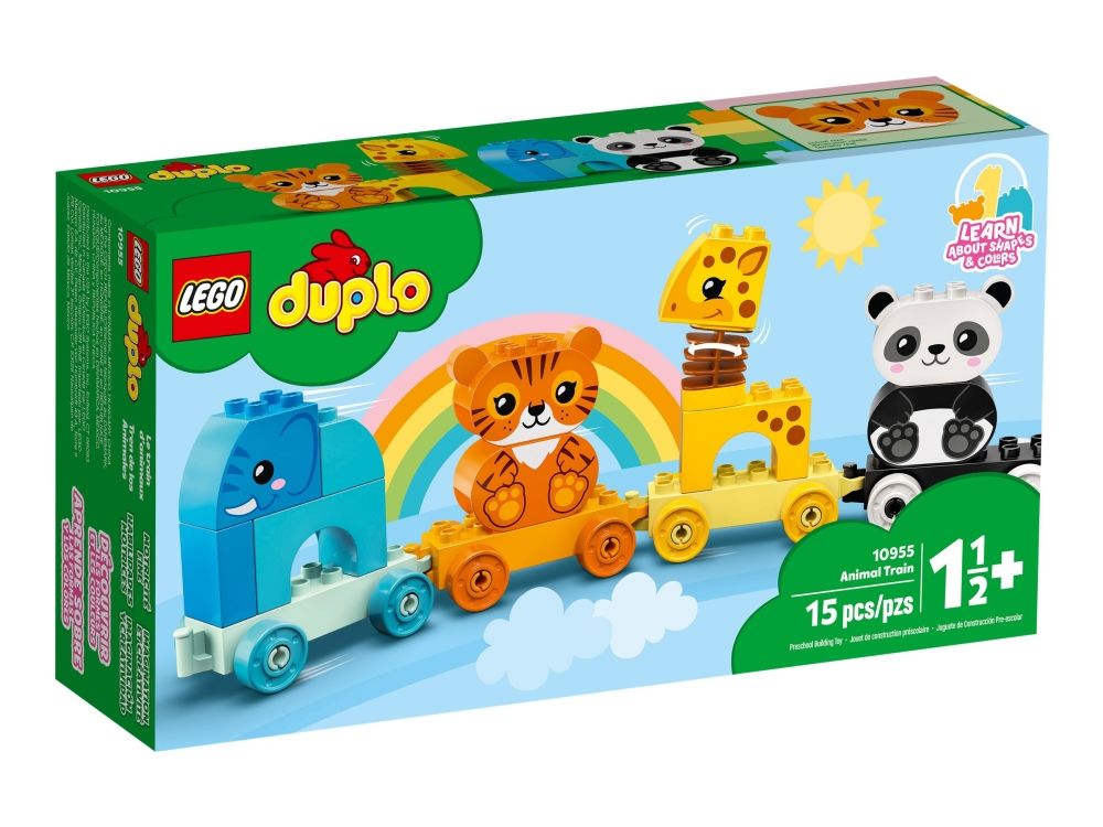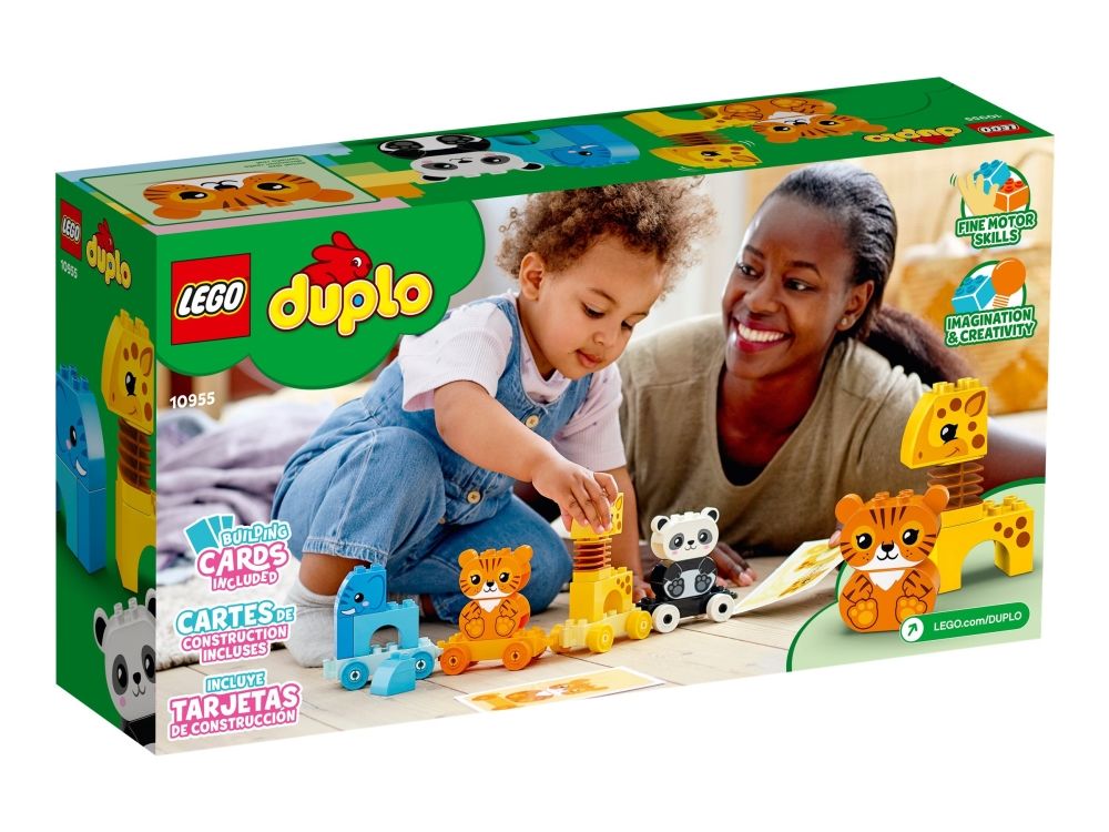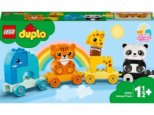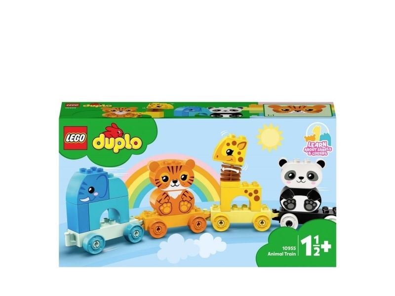 Das LEGO® DUPLO® Set Mein erster Tierzug (10955) führt Kinder spielerisch in das Tierreich ein. Spielzeug-Tierzug zum Ziehen Ein Elefant, ein Tiger, eine Giraffe und ein Panda bieten kleinen Tierfreunden jede Menge Bau- und Spielmöglichkeiten. Wenn Kleinkinder die Waggons bauen, umbauen und aufreihen und die Tiere vom Zug nehmen und stapeln, verbessern sie ihre Feinmotorik und entdecken die Magie fantasievoller Rollenspiele. Innovative Funktionen wie der Wackelhals der Giraffe verleihen diesem Lernspielzeug eine zusätzliche lustige Note. Das Set enthält Baukarten mit Bildern der Modelle (in Originalgröße), damit Kinder die Steine beim Bauen über das Bild legen können. Der Zug lässt sich jedoch auch an andere DUPLO Spielzeuge auf Rädern ankoppeln, um noch mehr Spielspaß zu vermitteln. LEGO® DUPLO® Lernspielzeuge ermöglichen Kleinkindern eine freie Selbstentfaltung und echten Lernspaß. Beim gemeinsamen Spielen lassen die Sets Eltern wichtige Entwicklungsschritte der Kinder erleben.